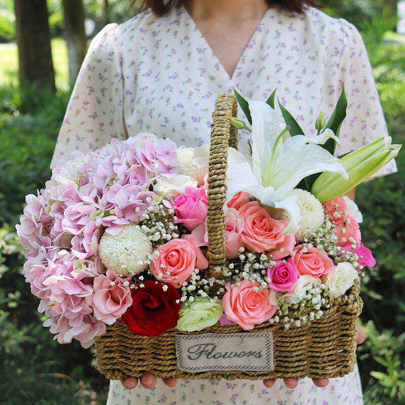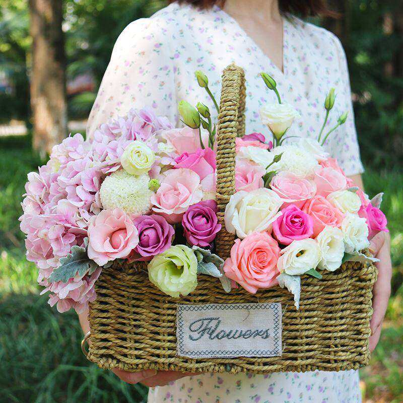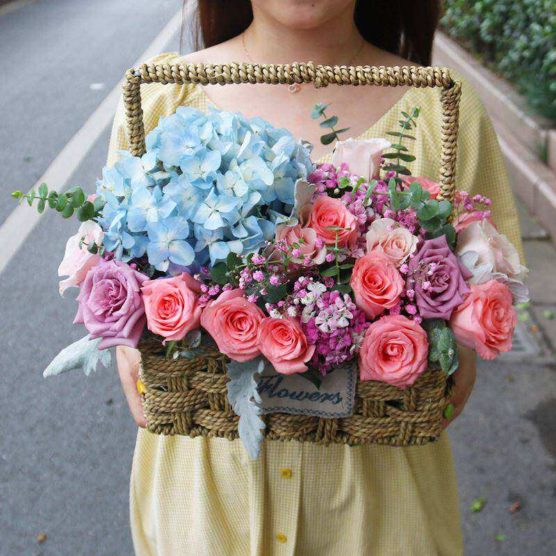 母亲节花束杭州绣球玫瑰混搭手提抱抱桶速递同城南京生日配送