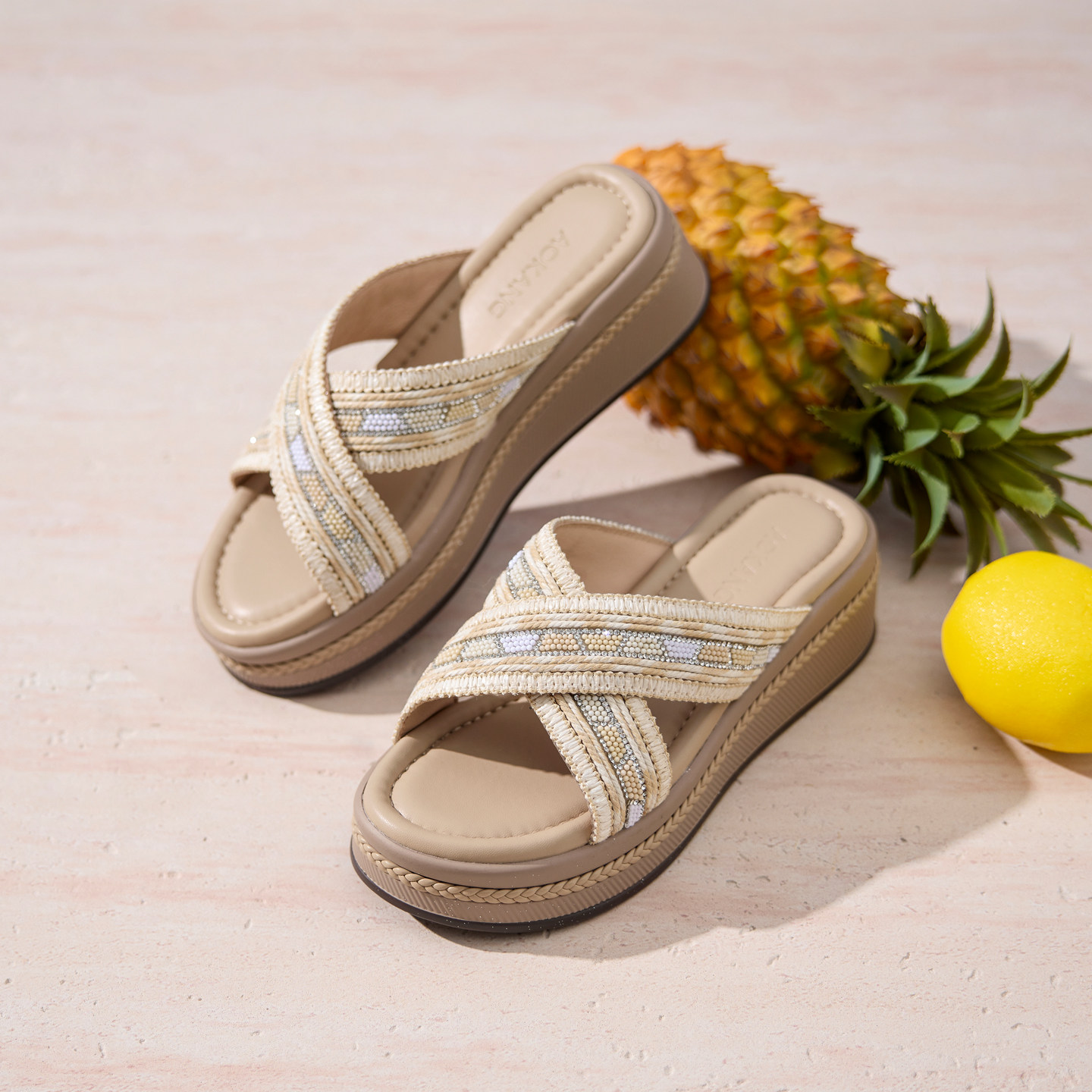奥康 女鞋2026夏季新款厚底法式编织坡跟一字拖外穿休闲沙滩凉拖