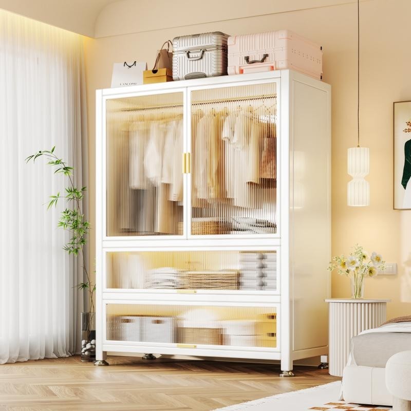 新款钢制衣柜家用卧室大容量多功能收纳柜储物柜一体靠墙防尘衣橱