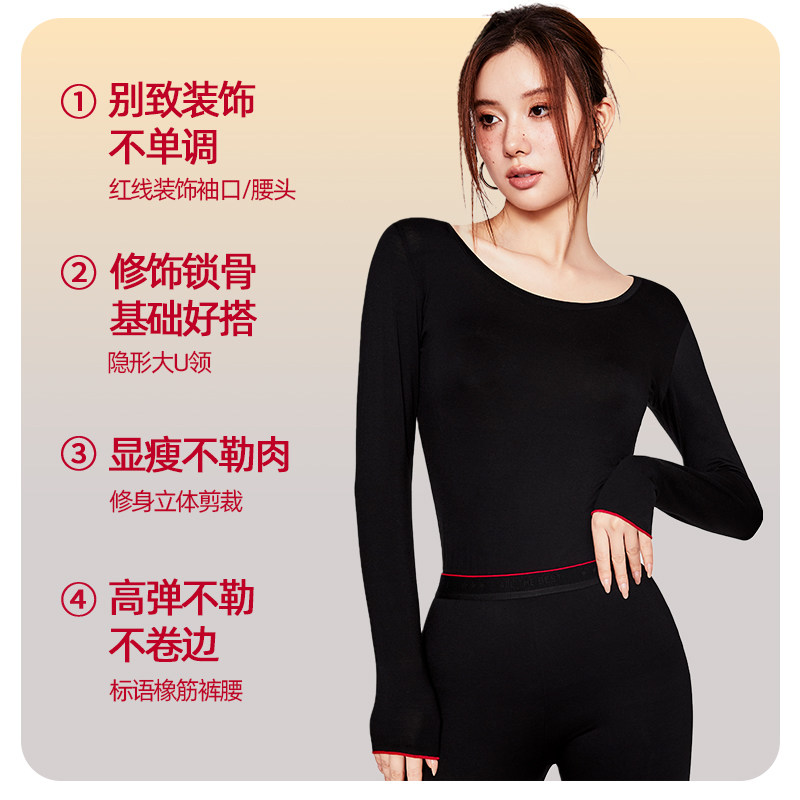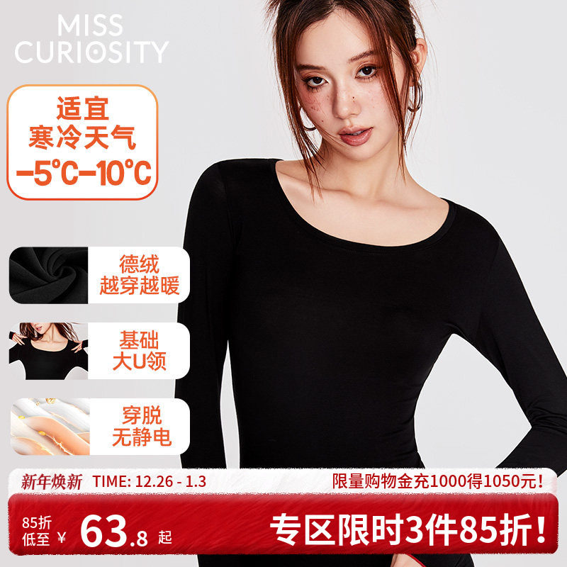 好奇蜜斯德绒保暖内衣秋衣秋裤套装女加绒加厚发热无痕打底衫黑色