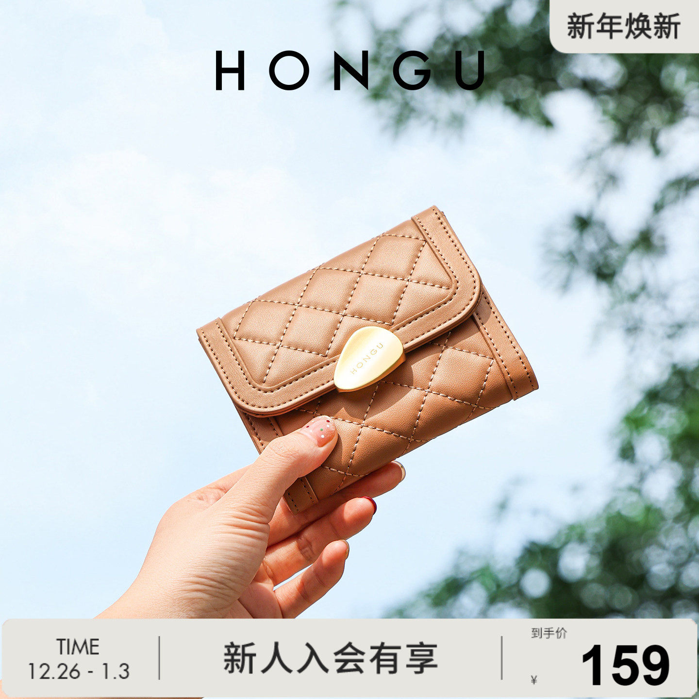 红谷新款牛皮钱包女短款折叠薄款皮夹时尚菱格长款钱夹零钱包手包