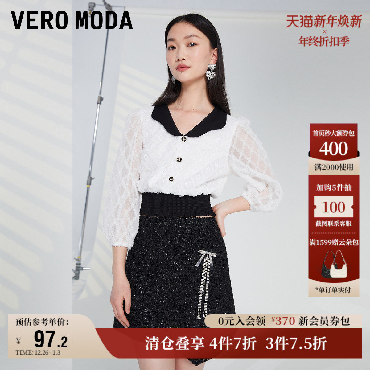 Vero Moda奥莱上衣女秋冬清仓复古撞色娃娃领甜美气质松紧腰百搭