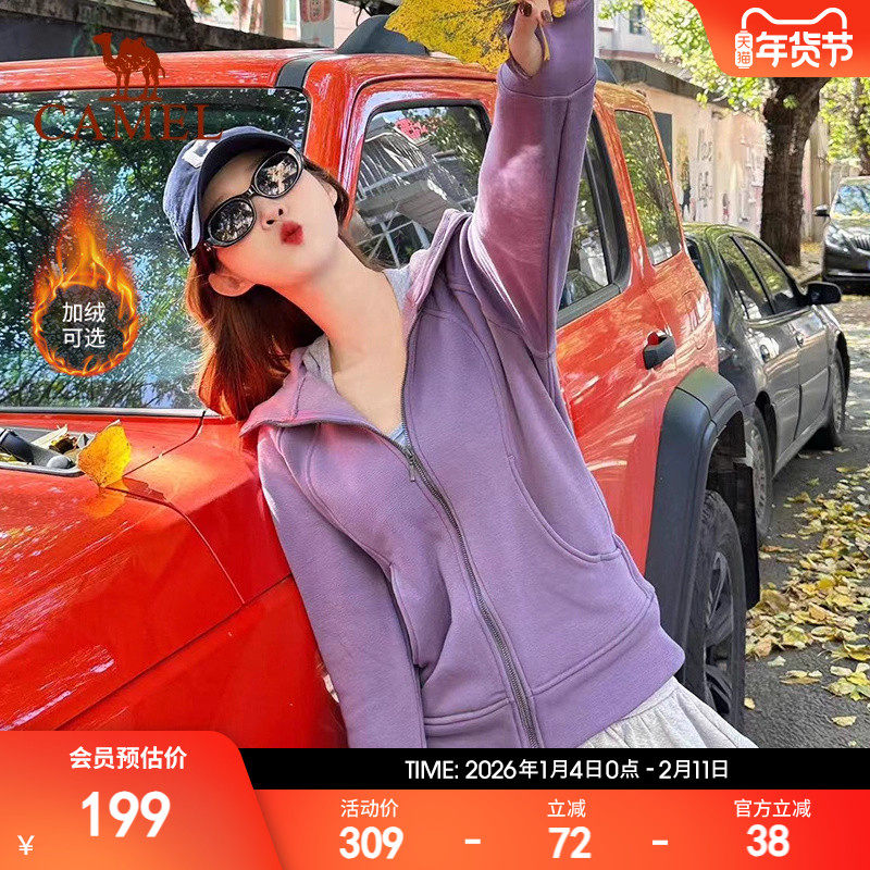 骆驼小蛮腰外套女士加绒收腰显瘦连帽卫衣开衫保暖上衣跑步运动服