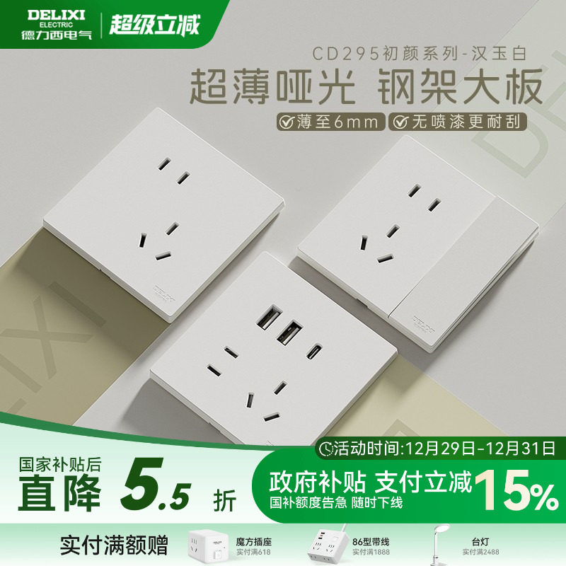 德力西官方旗舰店295超薄开关插座哑光五孔面板16A空调插座汉玉白