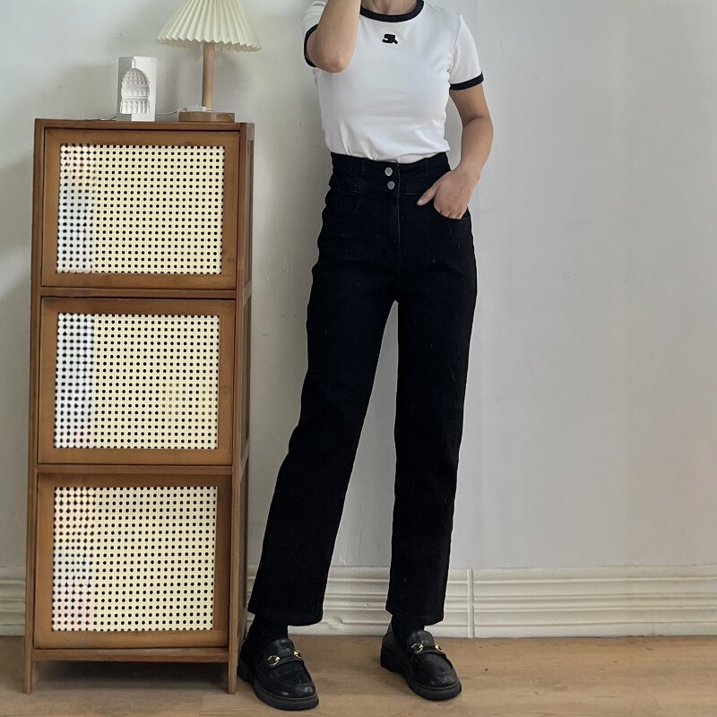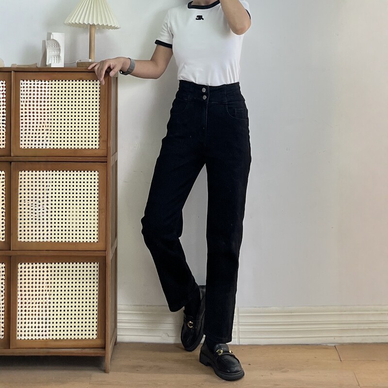 twosweet【超级裤神】四面弹重塑大长腿高腰直筒微喇叭原色牛仔裤