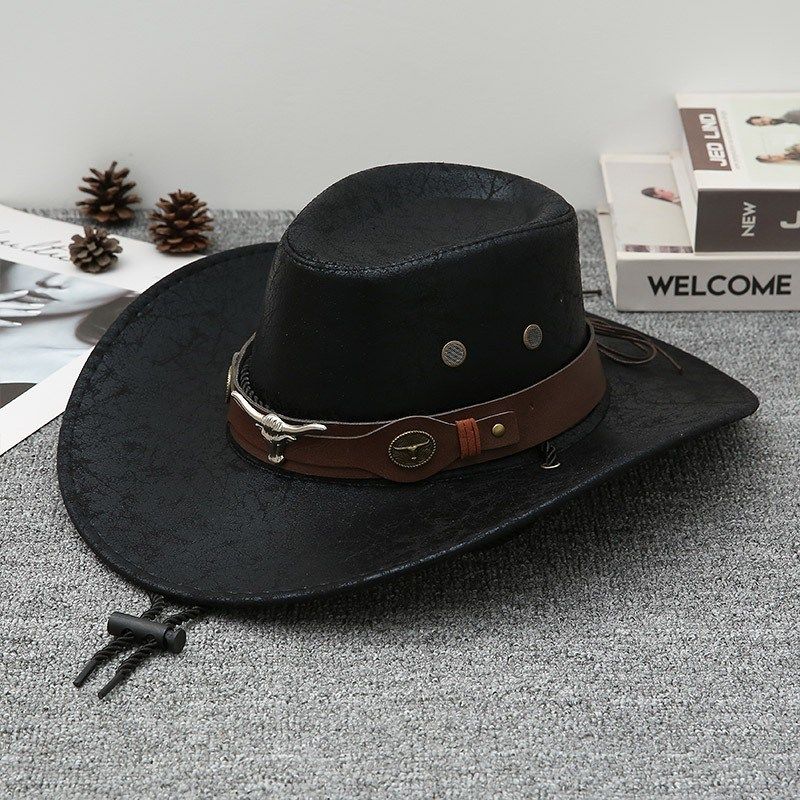 牛头皮带铆钉爵士帽男女春夏秋户外出游遮阳帽大沿藏族西部牛仔帽