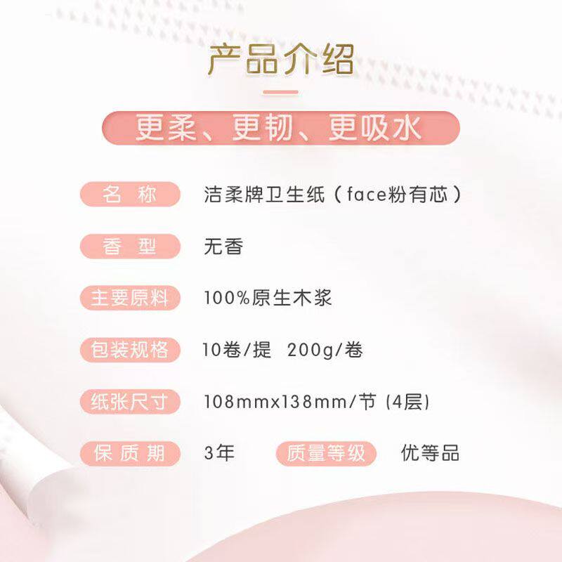 洁柔有芯卷纸粉face4层2000g10卷提装家用实惠厕所卷筒纸卫生纸