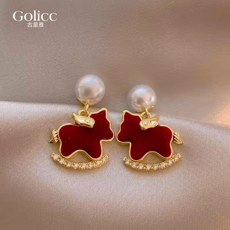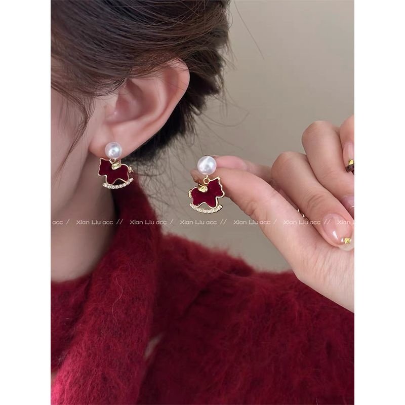 新年红色丝绒小马珍珠耳环女2025新款独特耳钉本命年气质银针耳饰