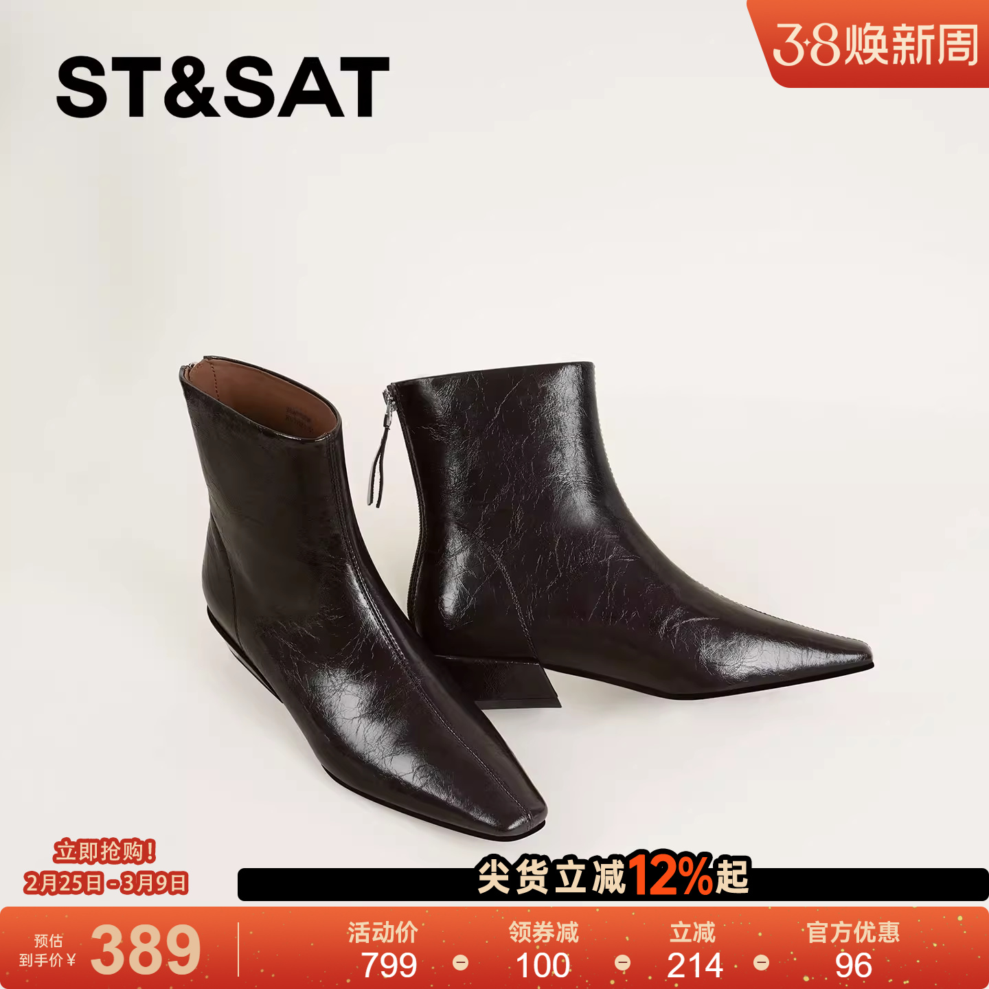 星期六法式短靴女2025秋冬气质方头粗跟高级感裸靴真皮英伦风皮靴