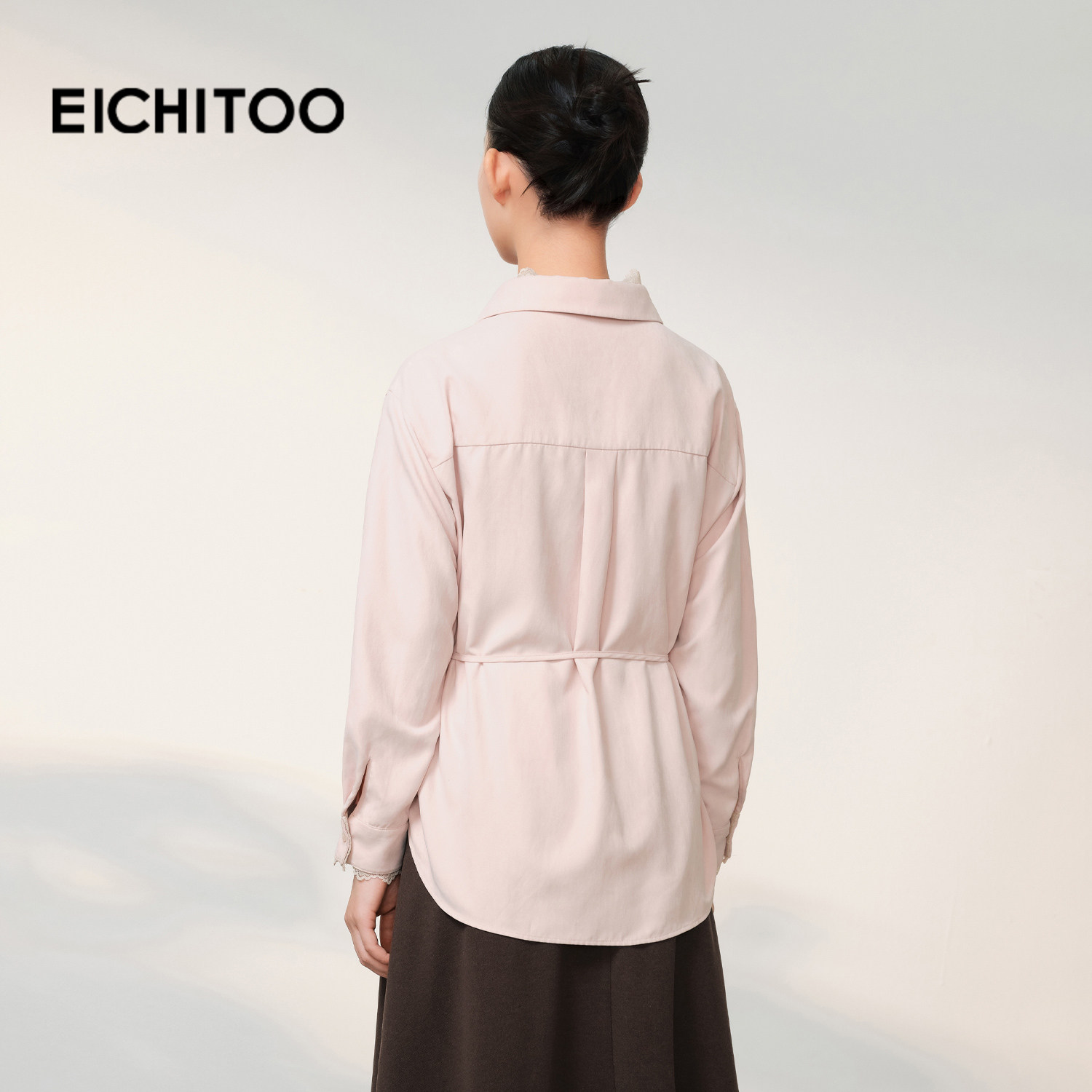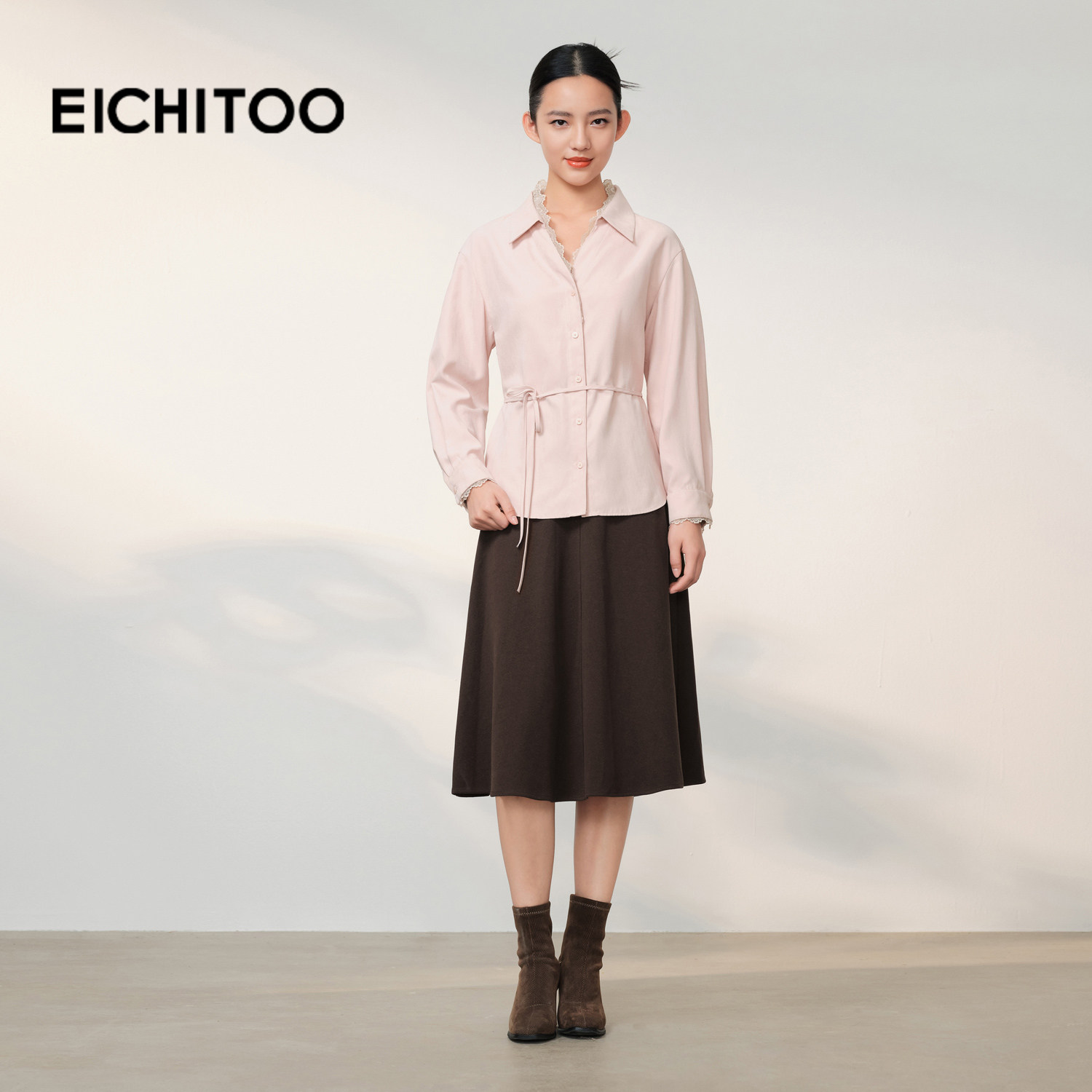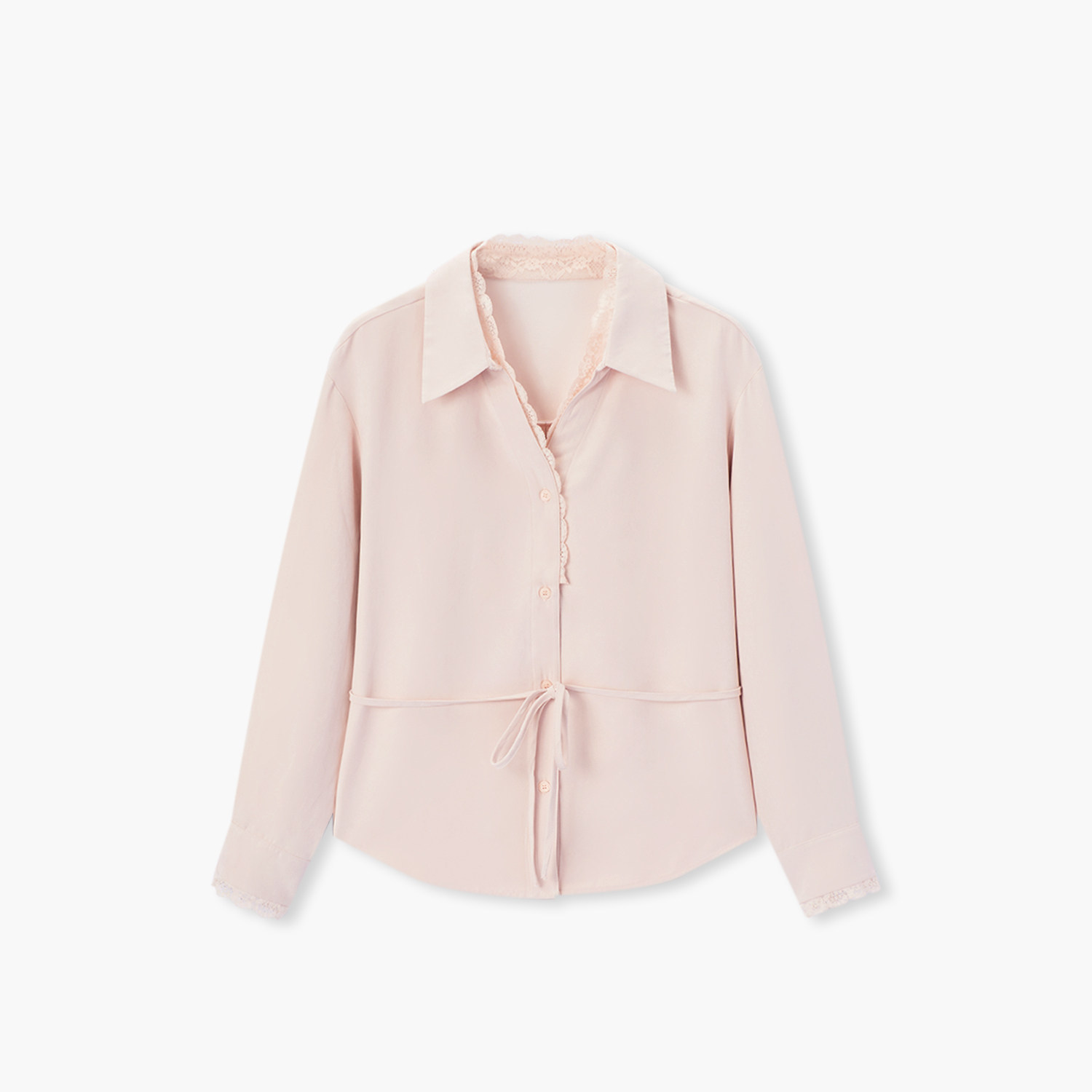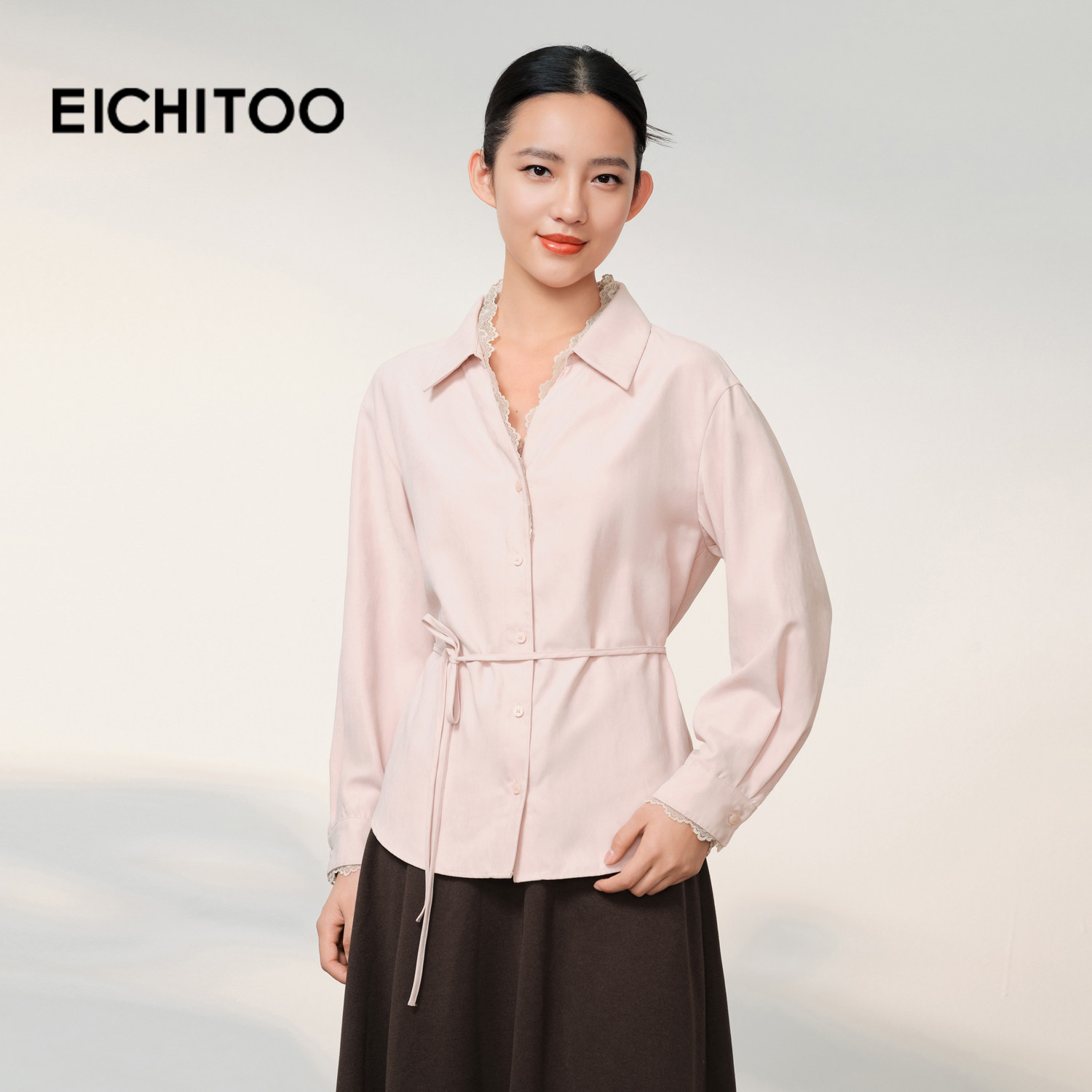爱居兔粉色优雅长袖翻领衬衫女2026年春季新款蕾丝设计感系带上衣