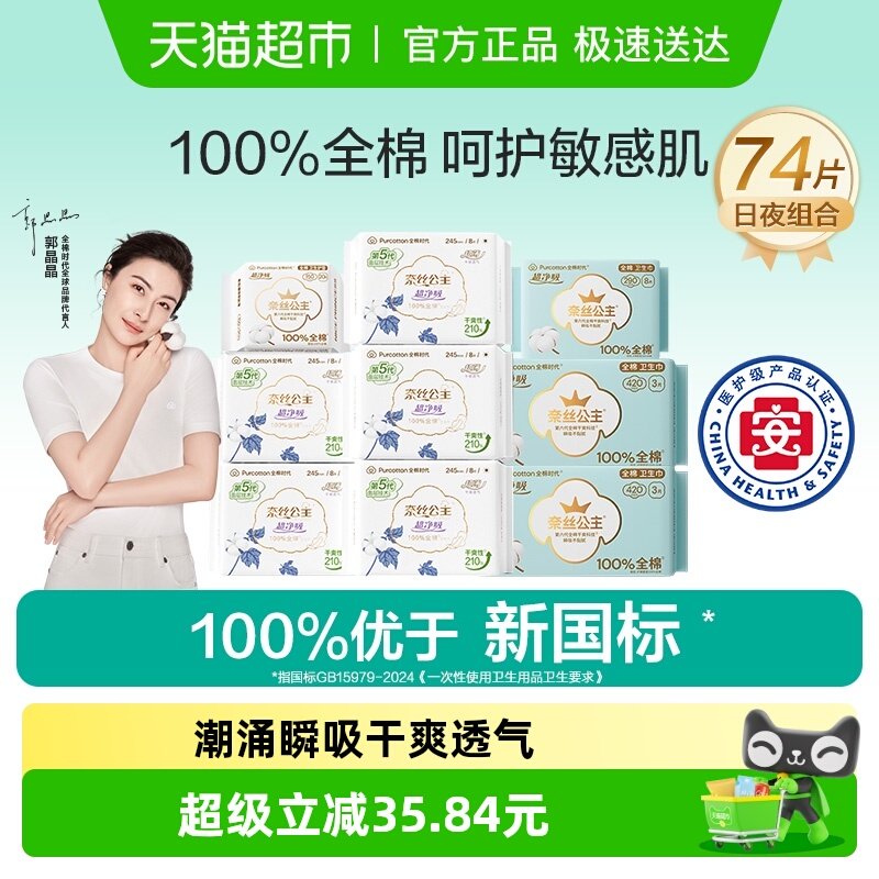 【优于新国标】全棉时代奈丝公主医护级卫生巾纯棉日夜组合