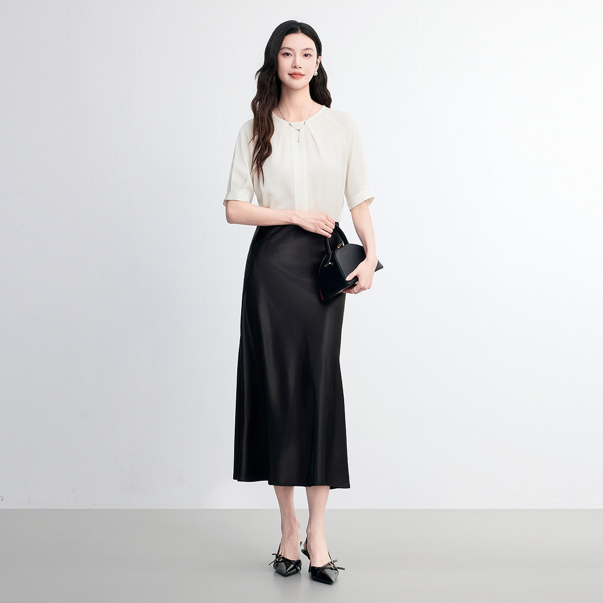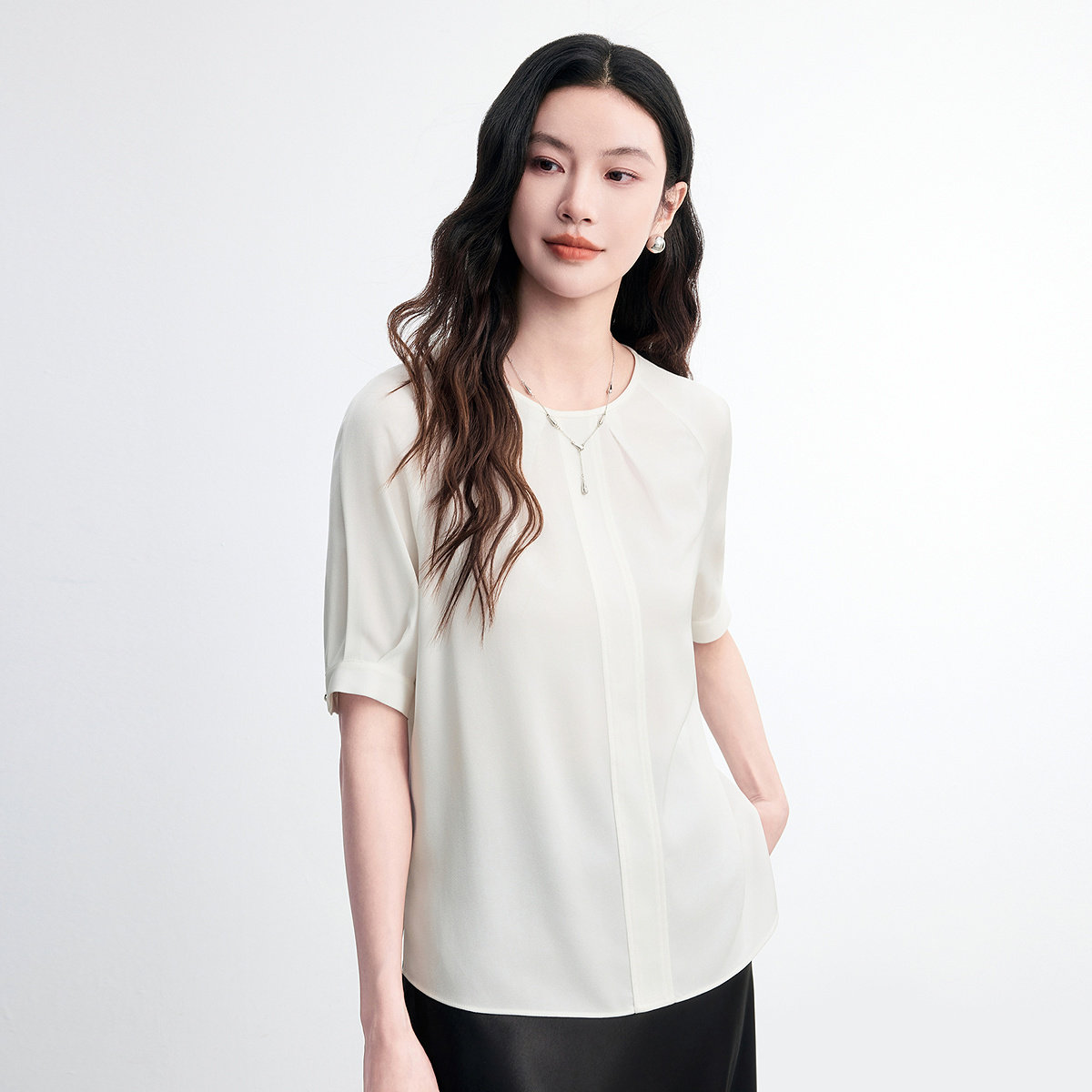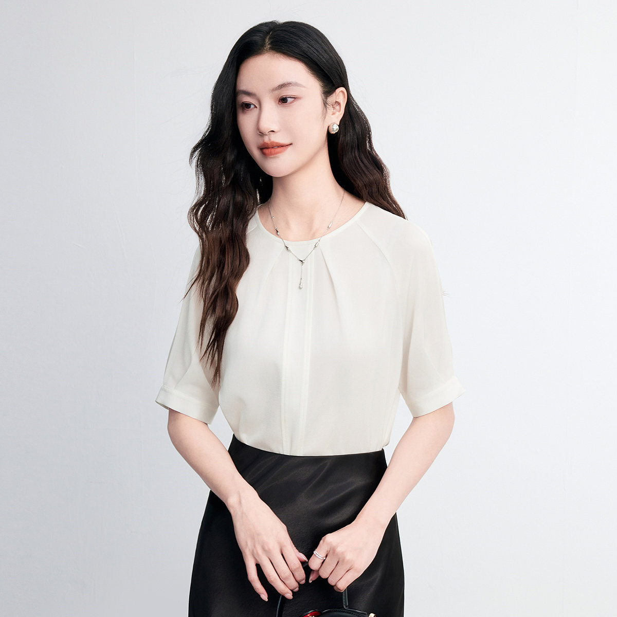 FINITY菲妮迪雪纺衫2026年春季新款简约白色捏褶设计感短袖上衣女
