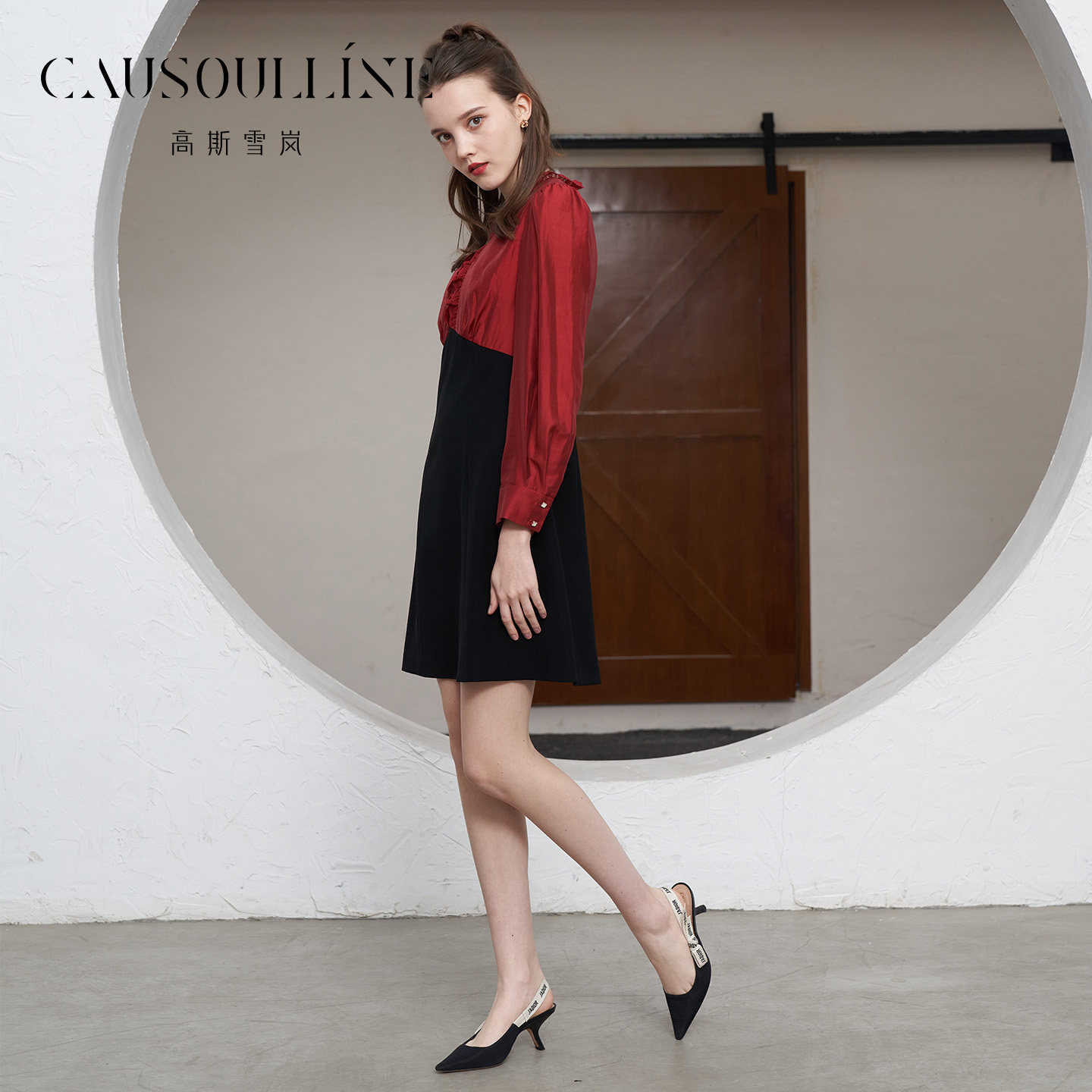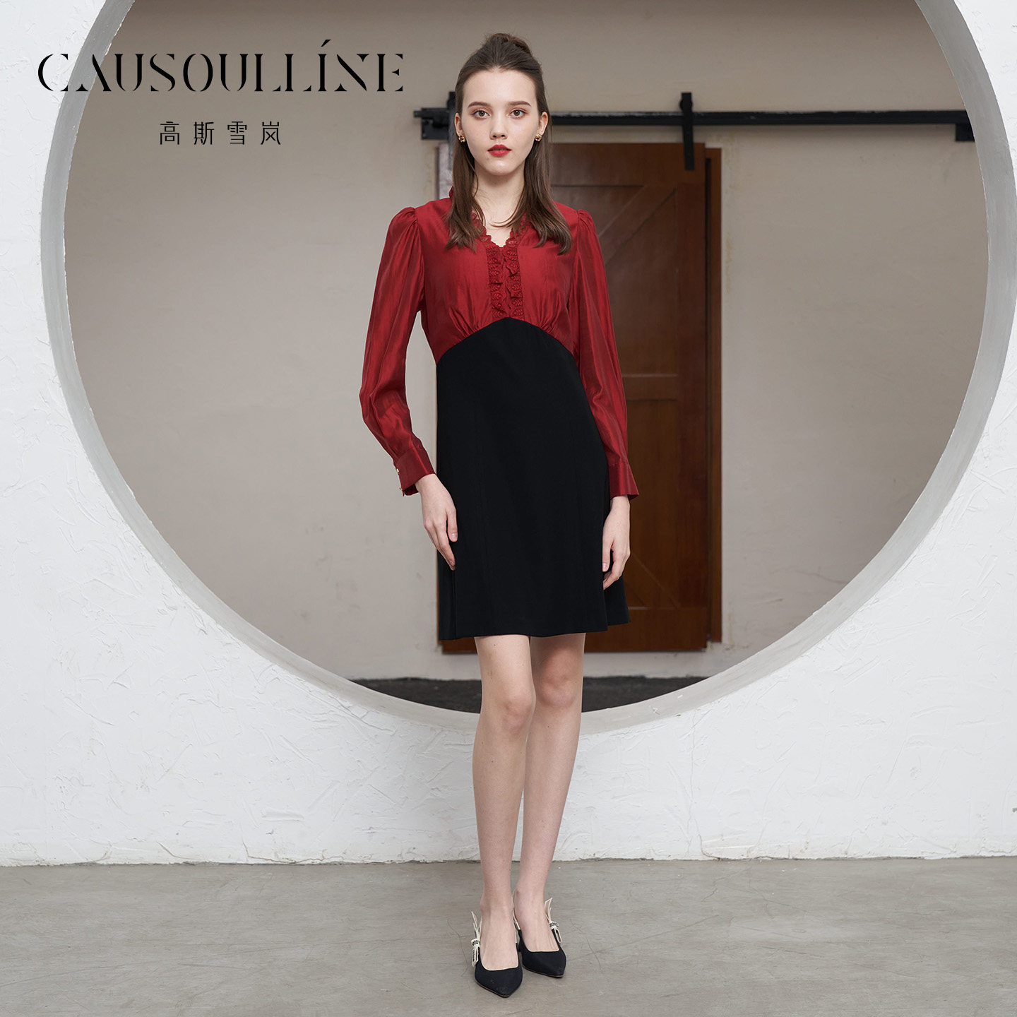 高斯雪岚法式拼色连衣裙女V领蕾丝收腰气质高级感复古裙 焕新