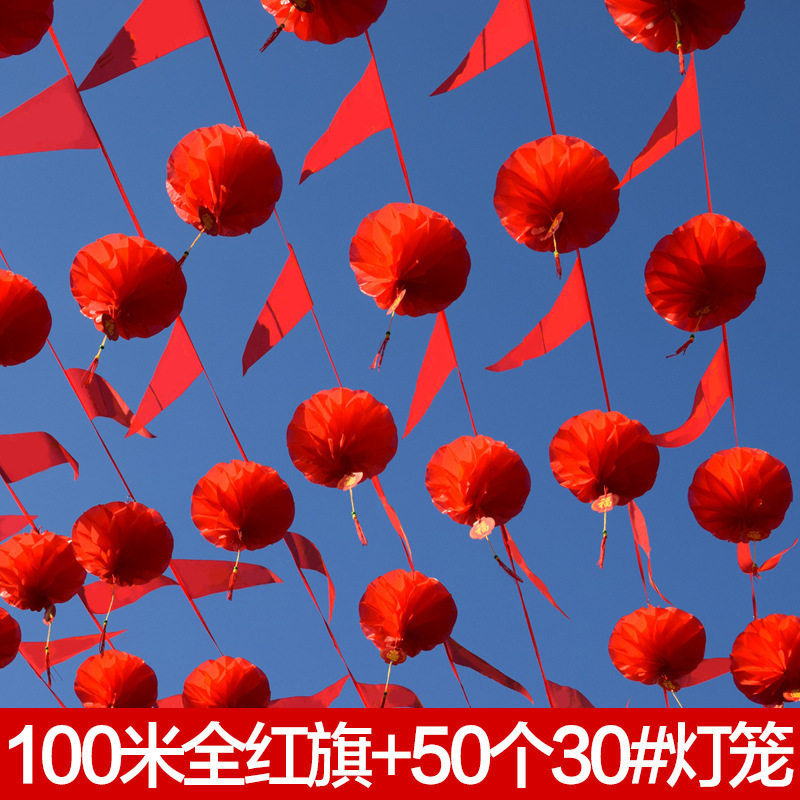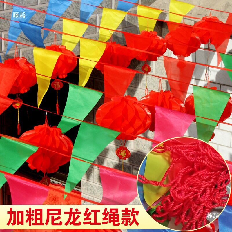 开业门店氛围装饰结婚婚庆三角小彩旗挂饰室外户外拉旗小红旗串旗加粗尼龙绳结婚全红色三角串旗商场装饰三角