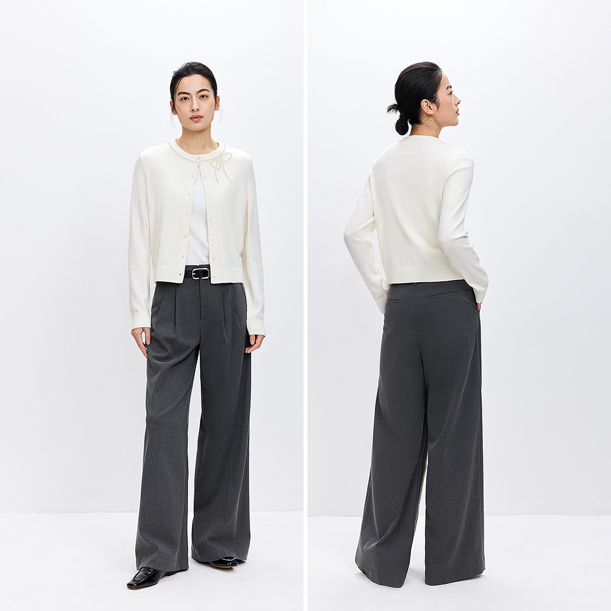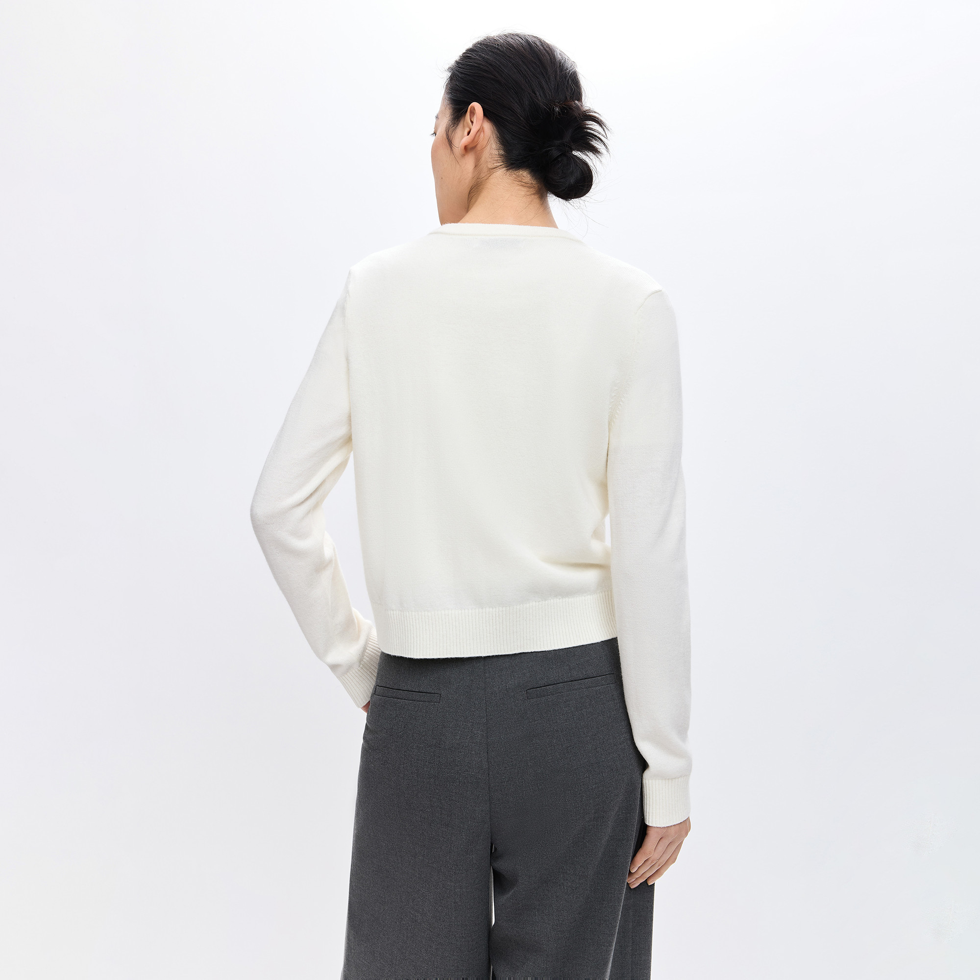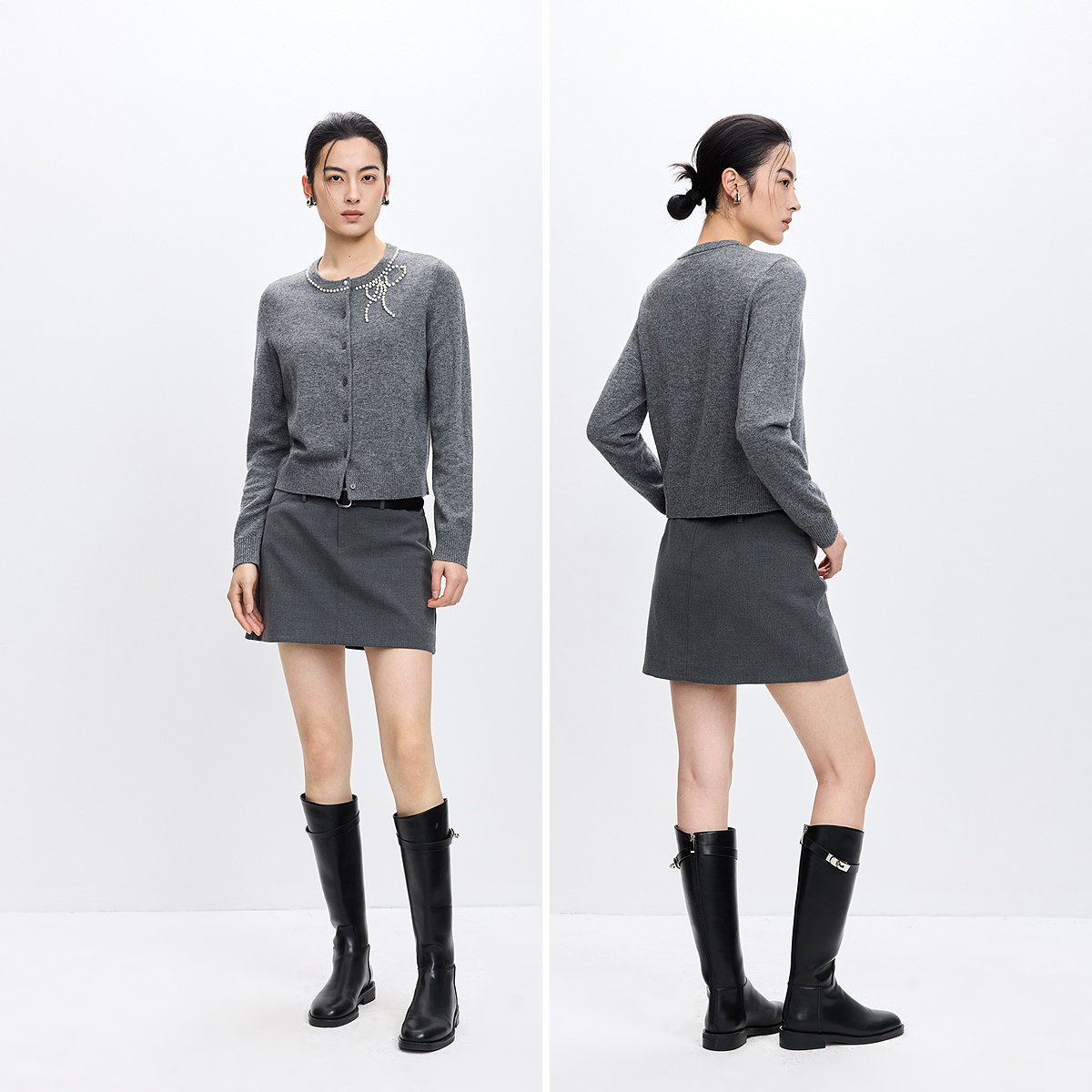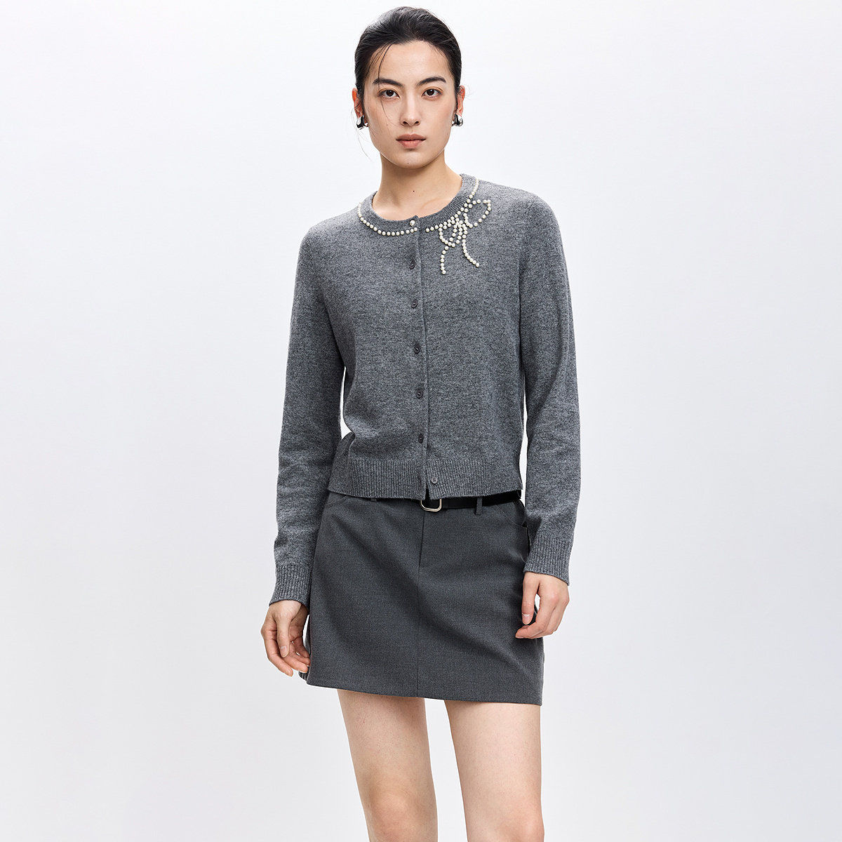 LILY2026春新款女装羊毛混纺蝴蝶结钉珠圆领气质通勤针织开衫外套