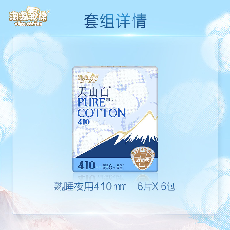 【国标消毒级】淘淘氧棉天山白消毒级纯棉卫生巾夜用410mm姨妈巾