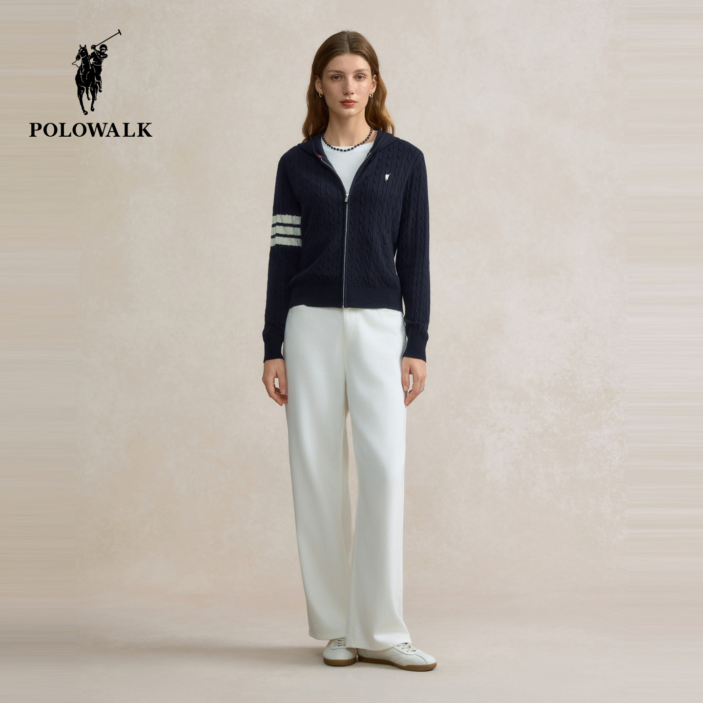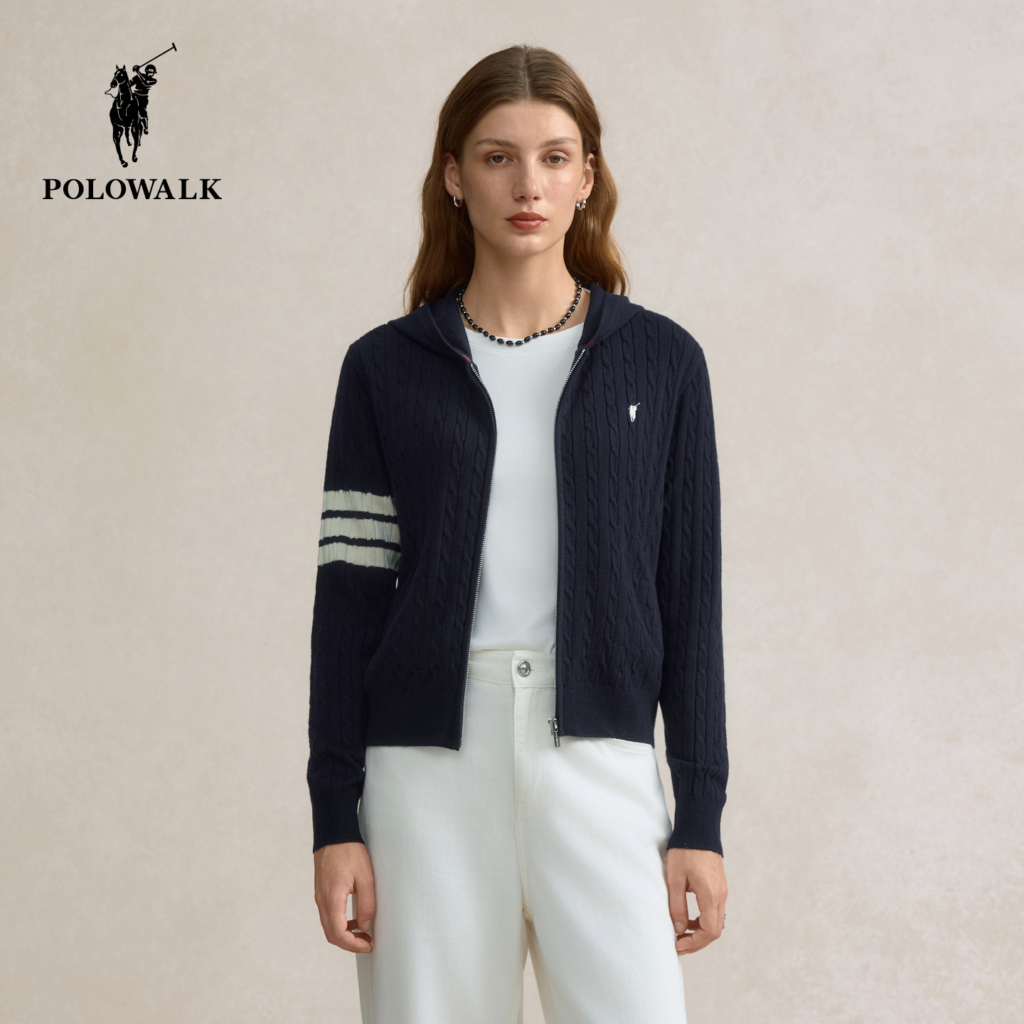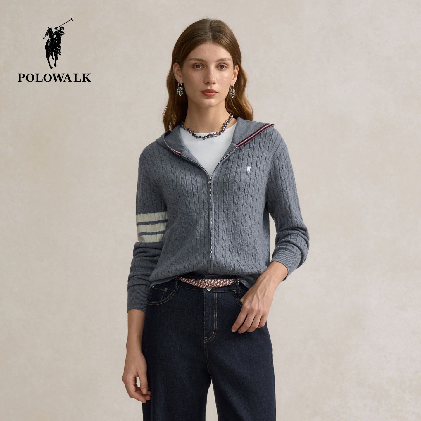 【特惠】POLOWALK女士长袖针织衫春季款连帽拉链撞色上衣外套