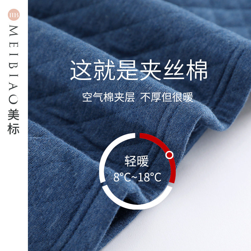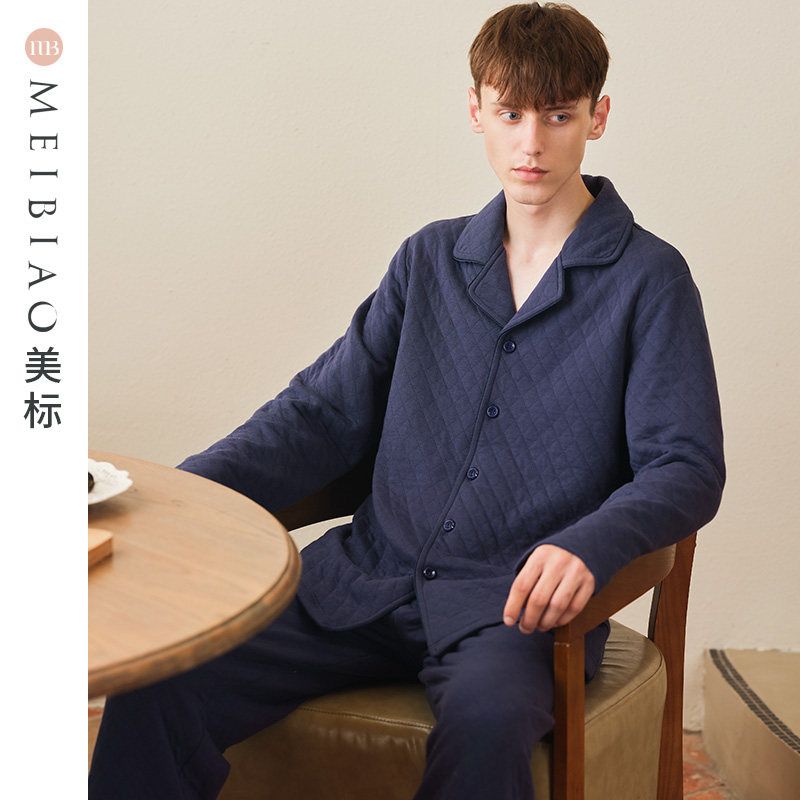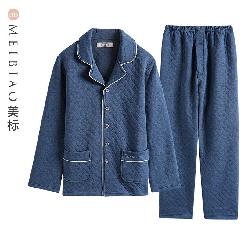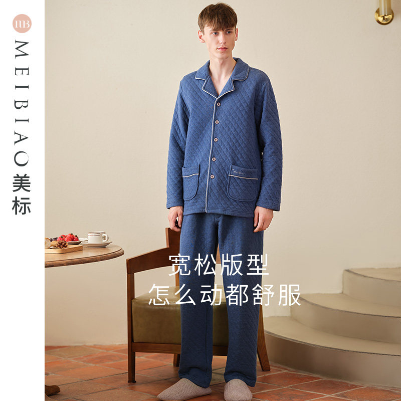 美标三层加厚保暖薄夹棉纯棉睡衣套装男士春秋全棉可外穿家居服冬