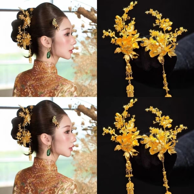 新娘金色牡丹发夹百搭头饰流苏侧边边夹龙凤褂旗袍配饰喜庆女对夹