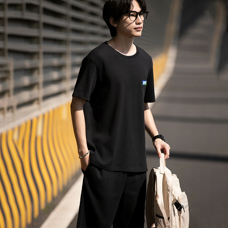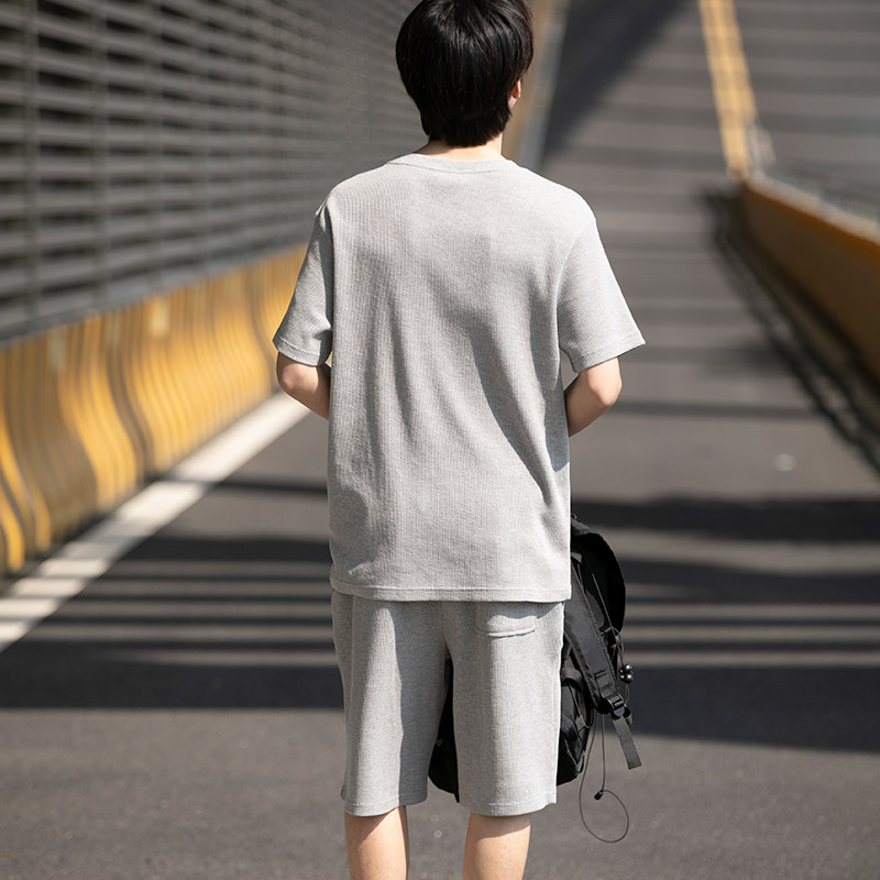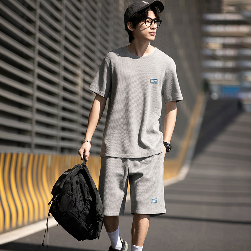 唐狮年夏季新款休闲运动套装男华夫格时尚短袖t恤套装男士短裤潮