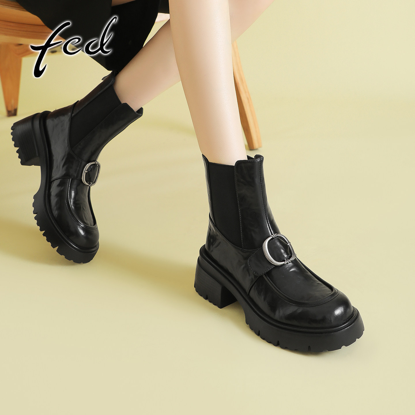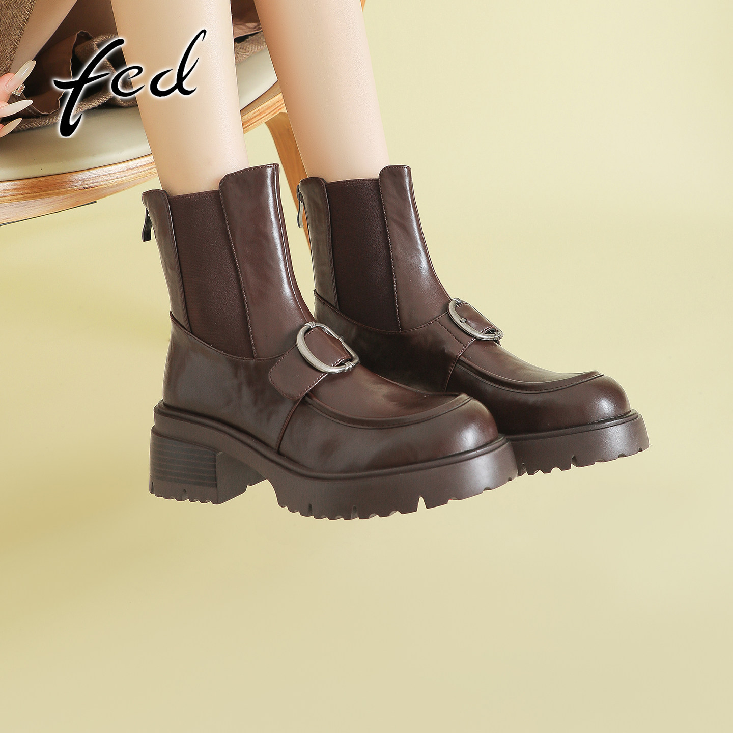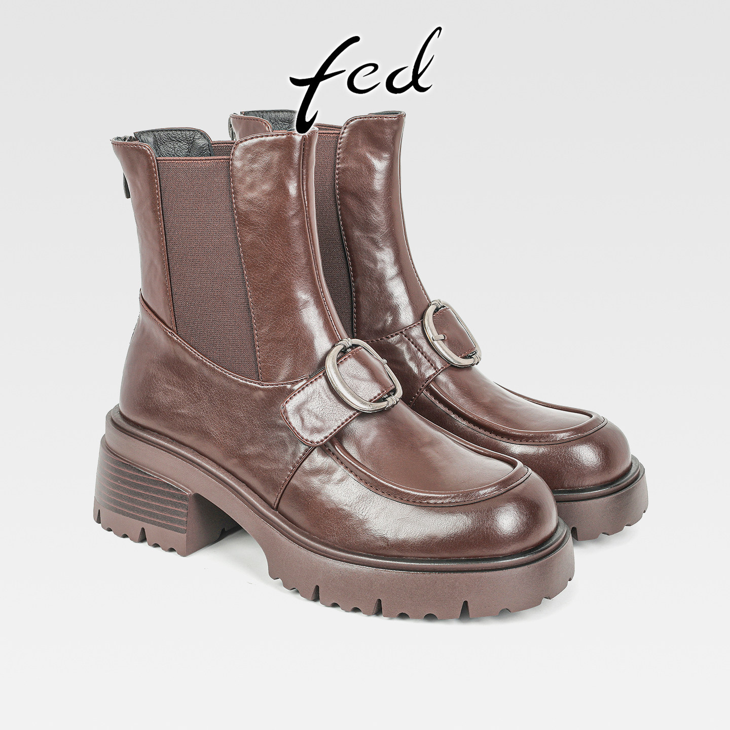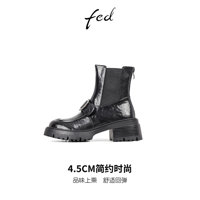 fed复古真皮粗跟厚底皮带扣切尔西短靴女秋冬新款中跟圆头马丁靴