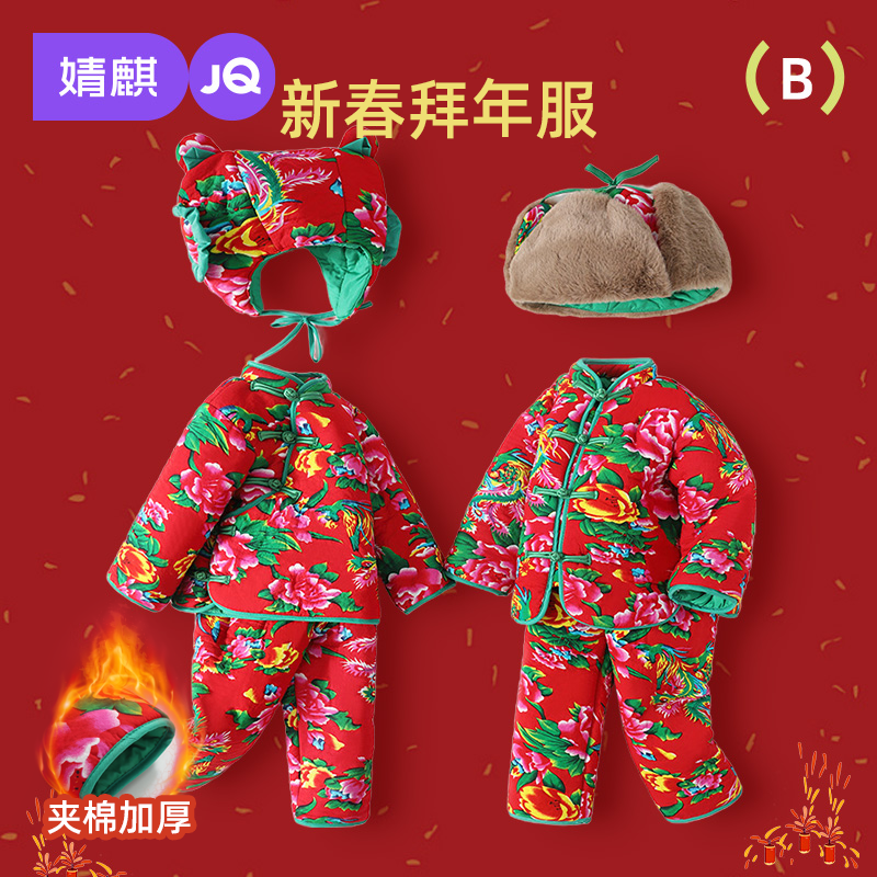 婧麒宝宝东北花棉袄套装儿童冬季拜年服男女童加厚棉服过年衣服