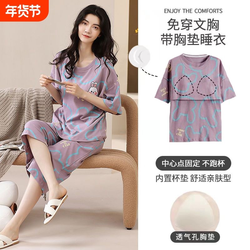 夏季大码自带胸垫夏季睡衣女短袖七分裤胖mm200斤卡通家居服套装