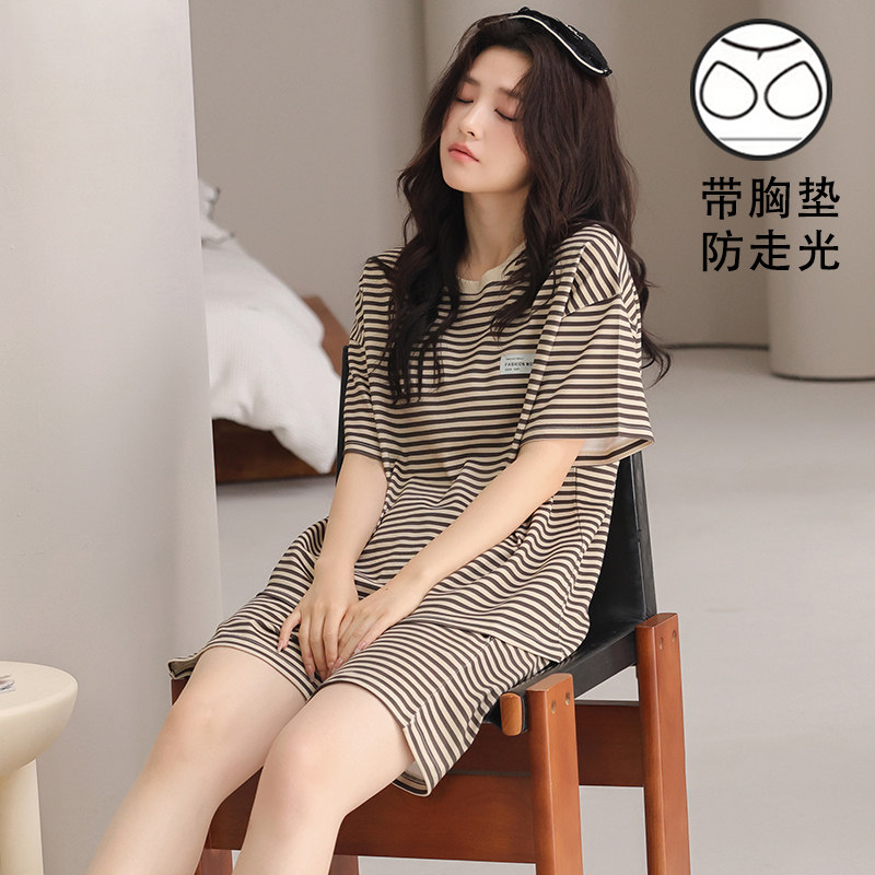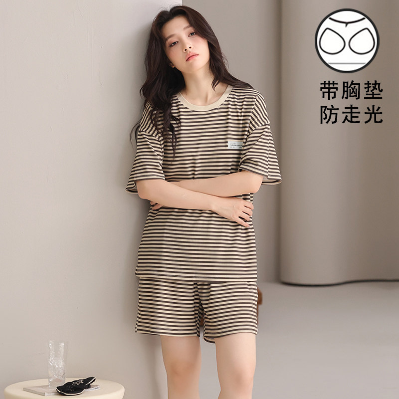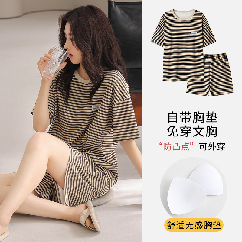 睡衣女夏短袖带胸垫高级感2025新款家居服套装休闲针织条纹薄款
