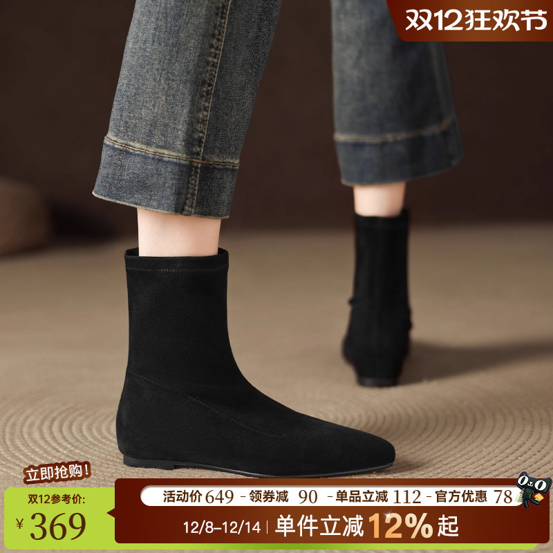 星期六黑色尖头短靴女2025新款秋冬靴子绒面平底弹力袜靴瘦瘦靴鞋