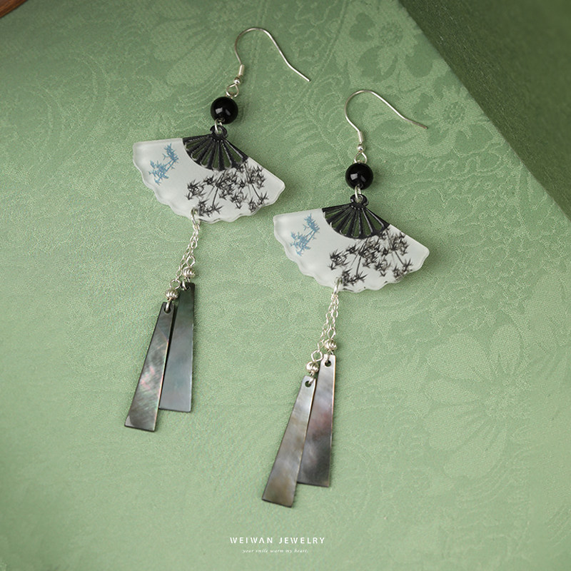 复古新中式国风墨竹扇形流苏耳环气质耳坠新款高级感个性气质耳饰