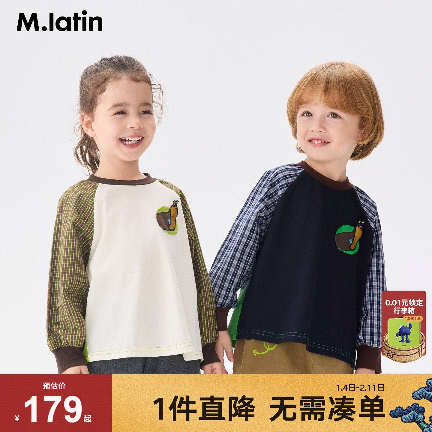 马拉丁儿童T恤26春装新款女小童撞色格子插肩袖舒爽棉长袖T恤