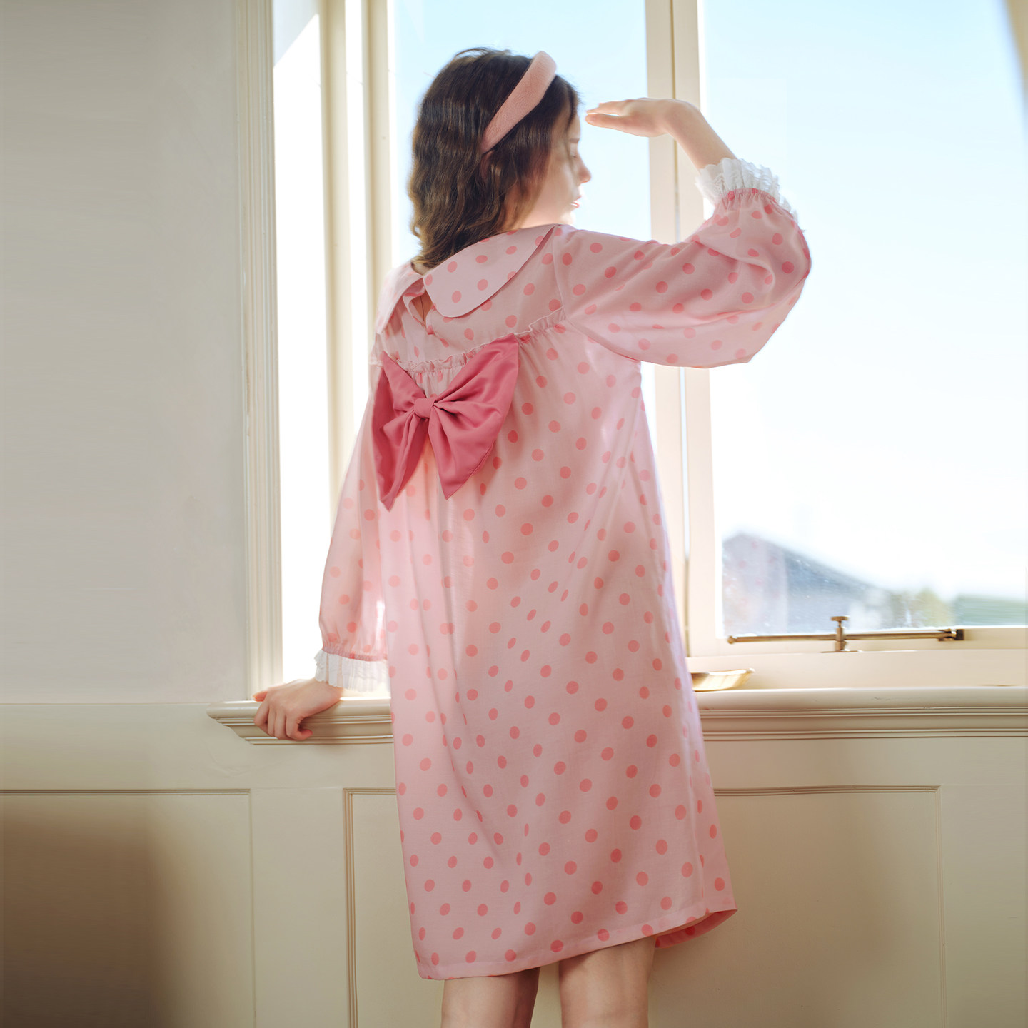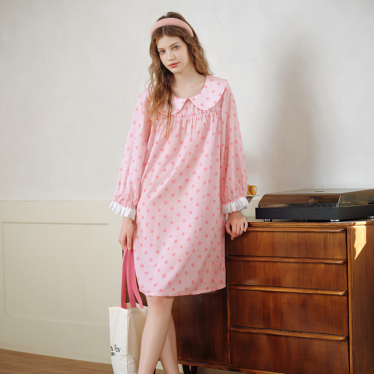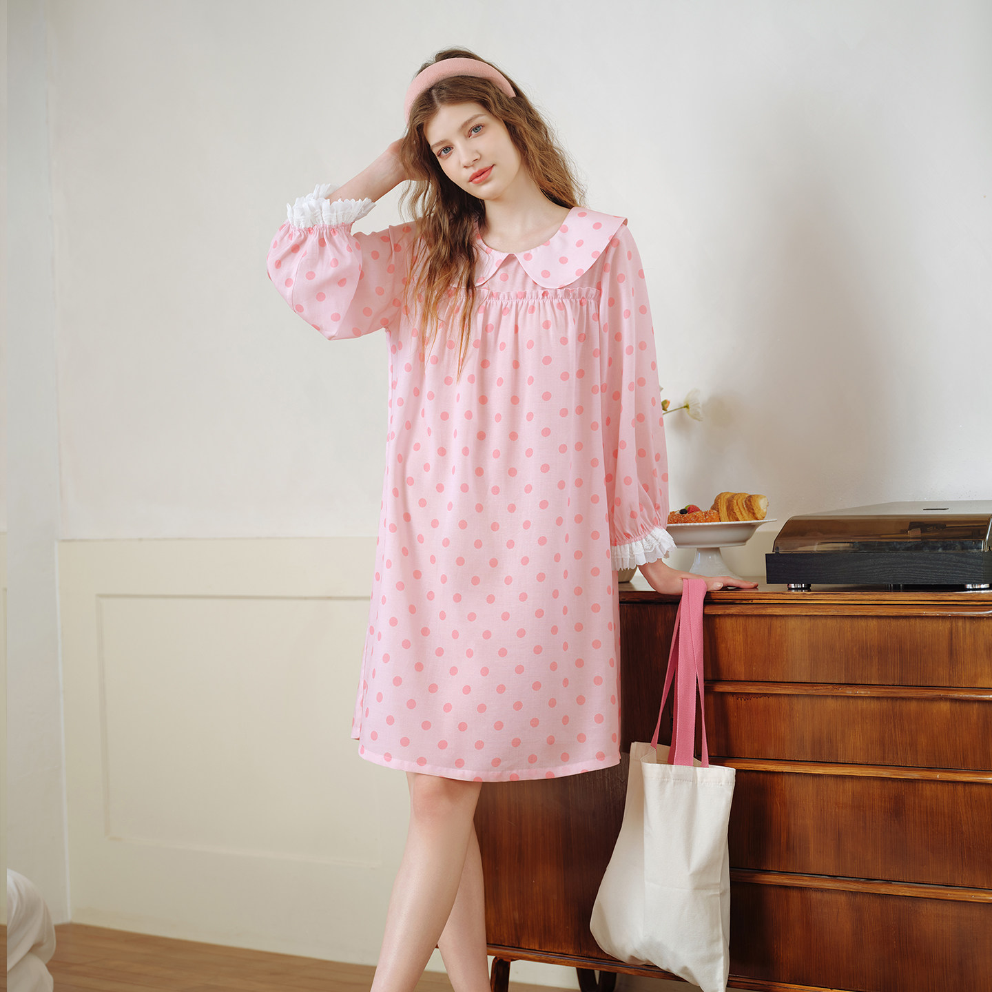 美标新品九分袖纯棉睡裙女春夏甜美可外穿睡衣蕾丝波点全棉家居服