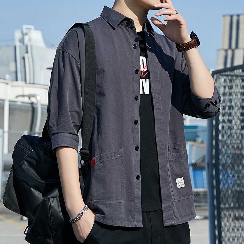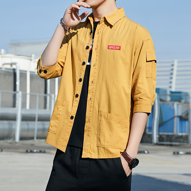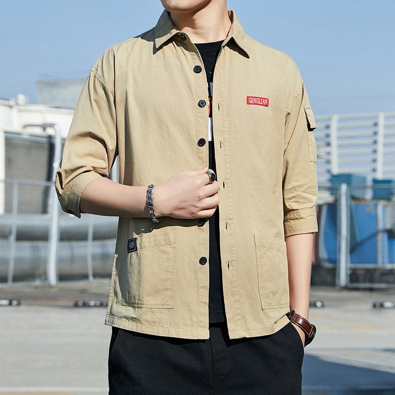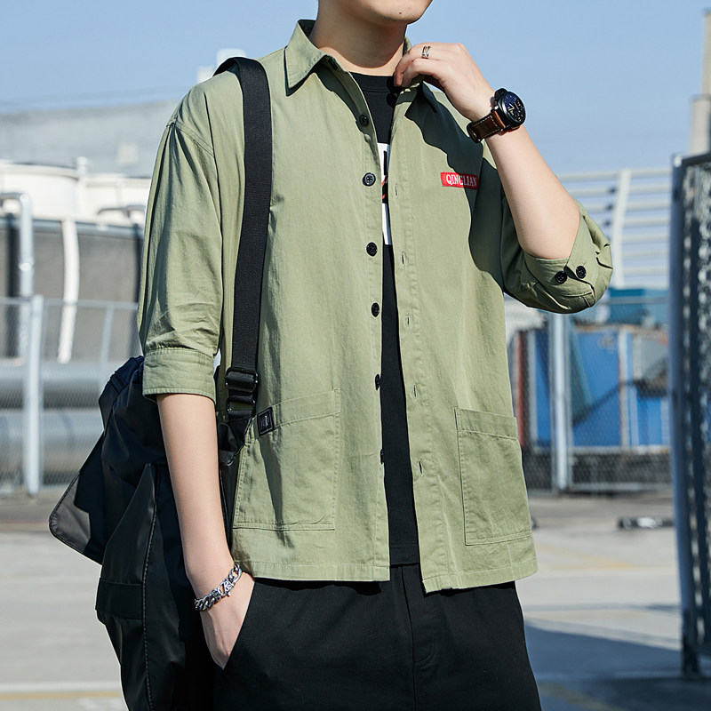 工装衬衫男士夏季七分短袖寸衫潮流衣服港风日系休闲痞帅衬衣外套