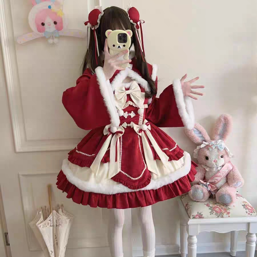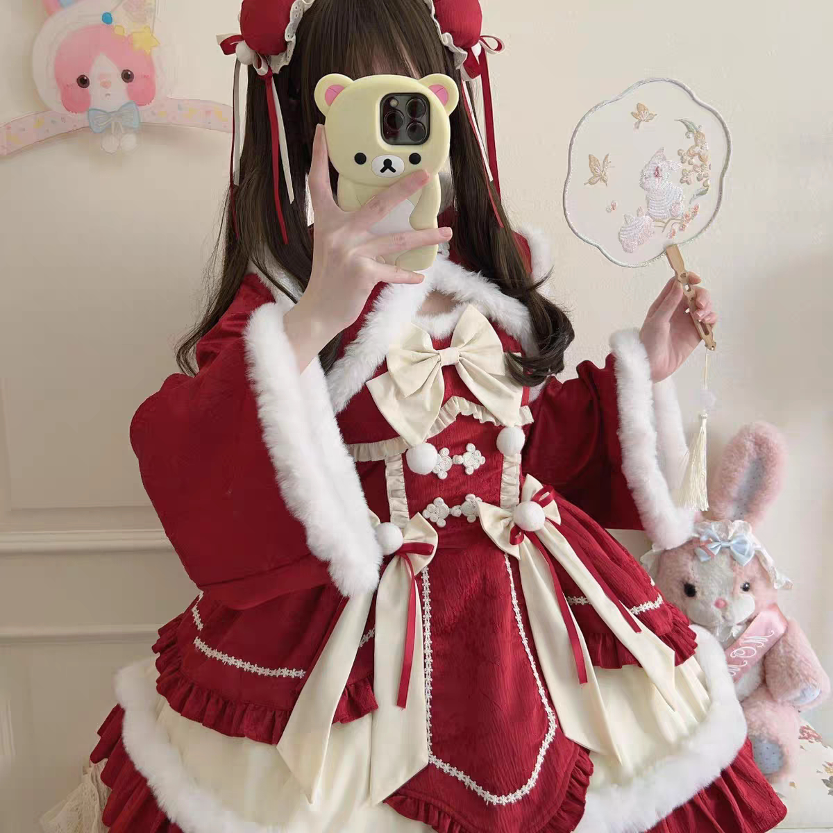 全套新年战袍桃眠梅意Lolita洋装新中式连衣裙甜美少女长袖红色冬