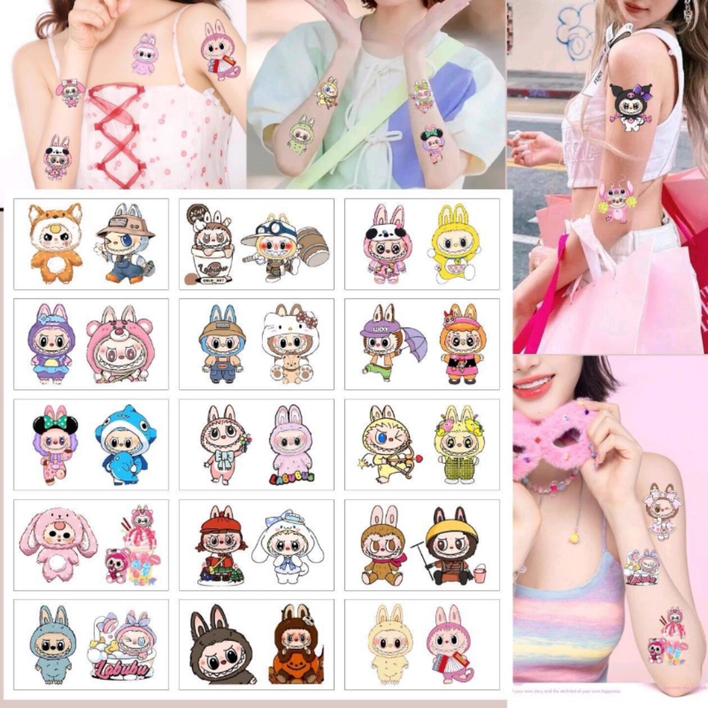 学生可洗装饰拉布布纹身贴防水卡通女生labubu可爱闪粉水印手臂贴