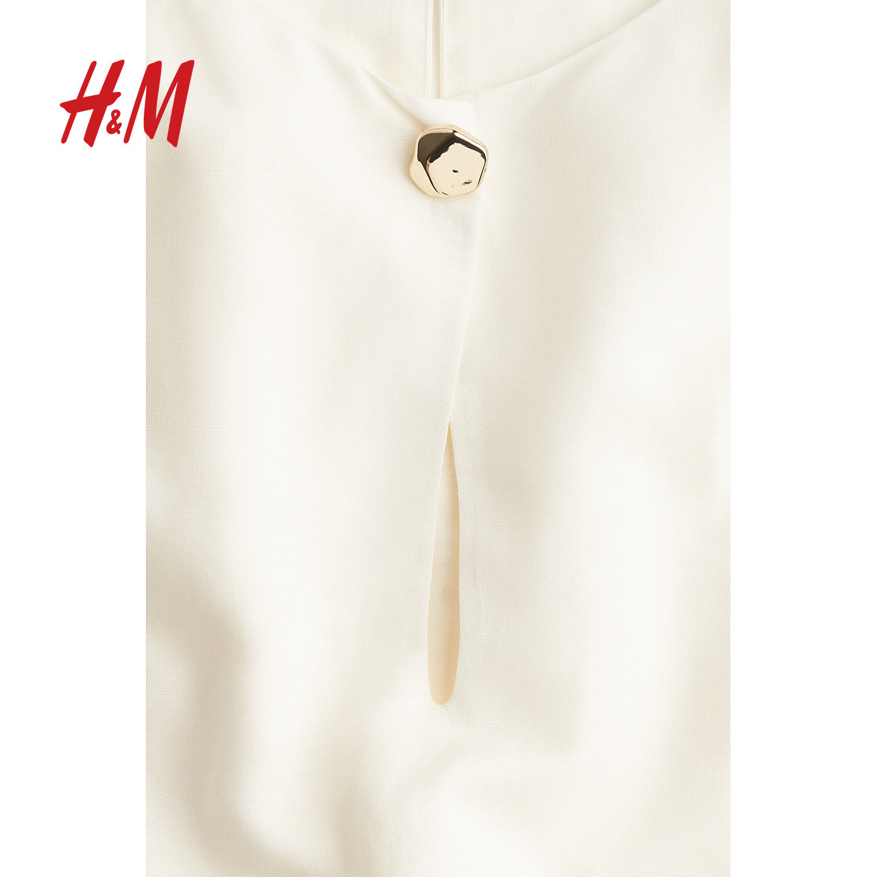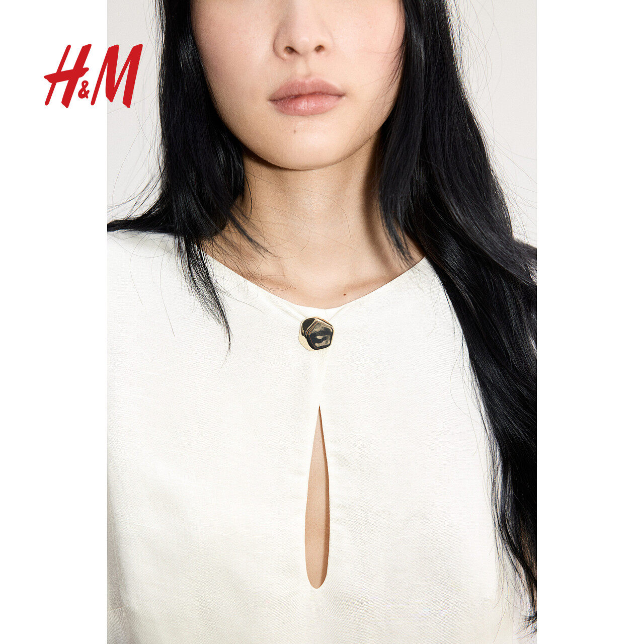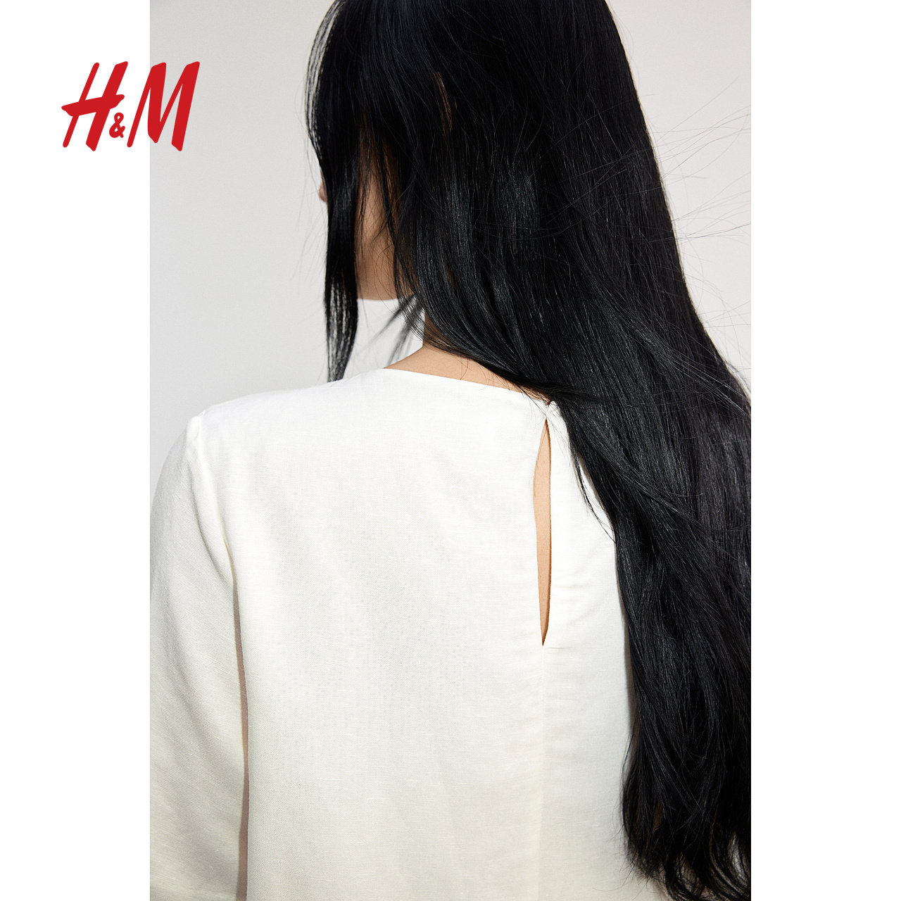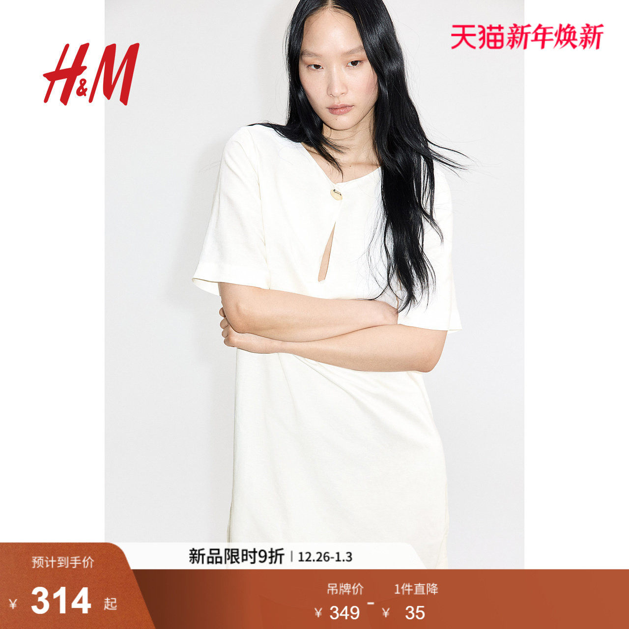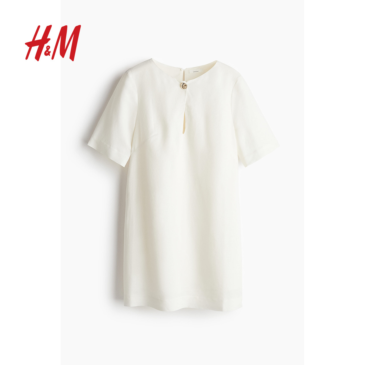 HM女装连衣裙2025冬季新款短袖圆领亚麻混纺直筒短款裙1289839