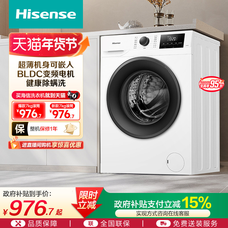 海信7公斤滚筒洗衣机全自动变频家用租房超薄洗衣机小型洗脱一体