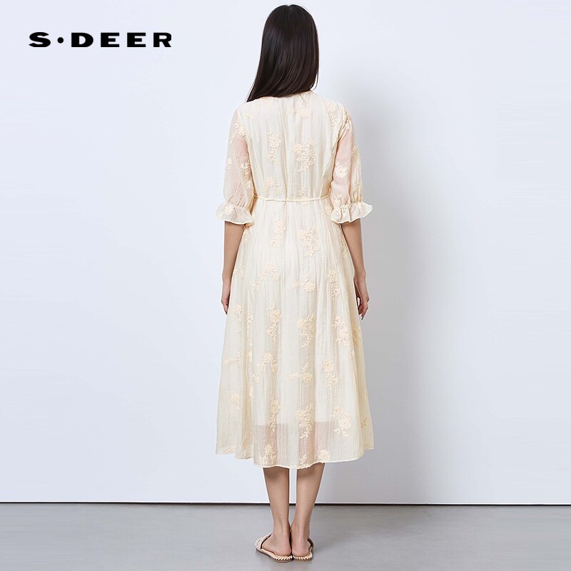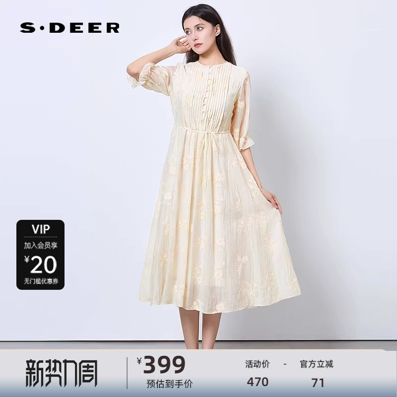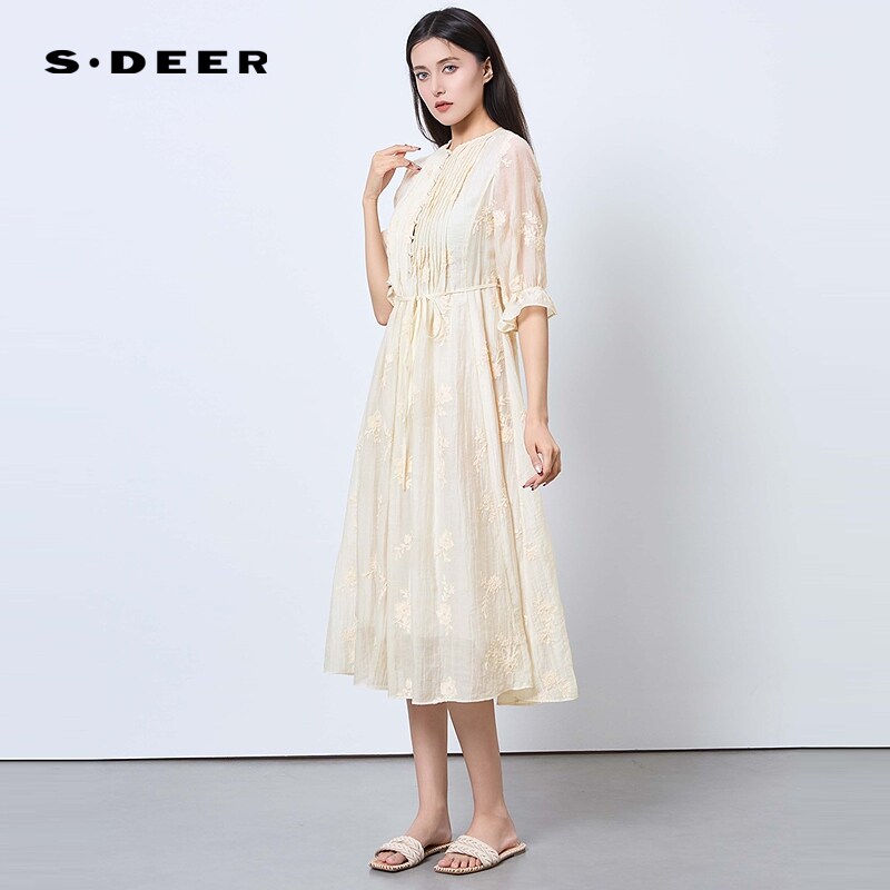 sdeer圣迪奥女装25年新品田园风圆领风琴褶绣花连衣裙S252Z1285