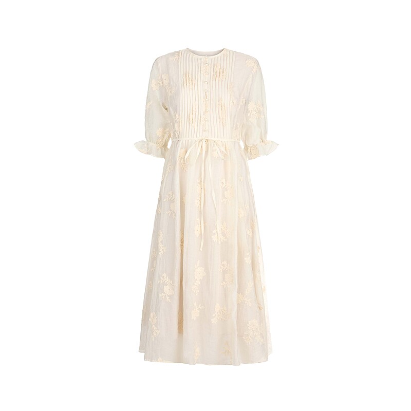 圆领连衣裙 风琴褶收腰 清新绣花