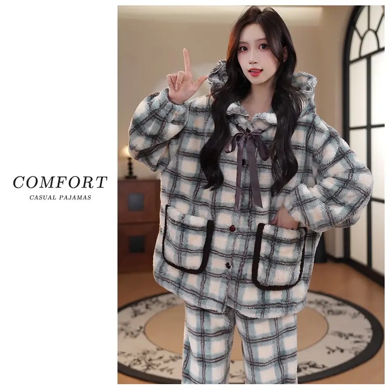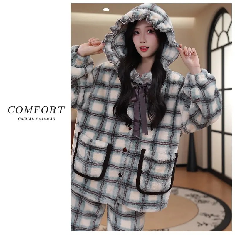 珊瑚绒睡衣女秋冬季2025新款加厚加绒女士休闲格子连帽冬天家居服