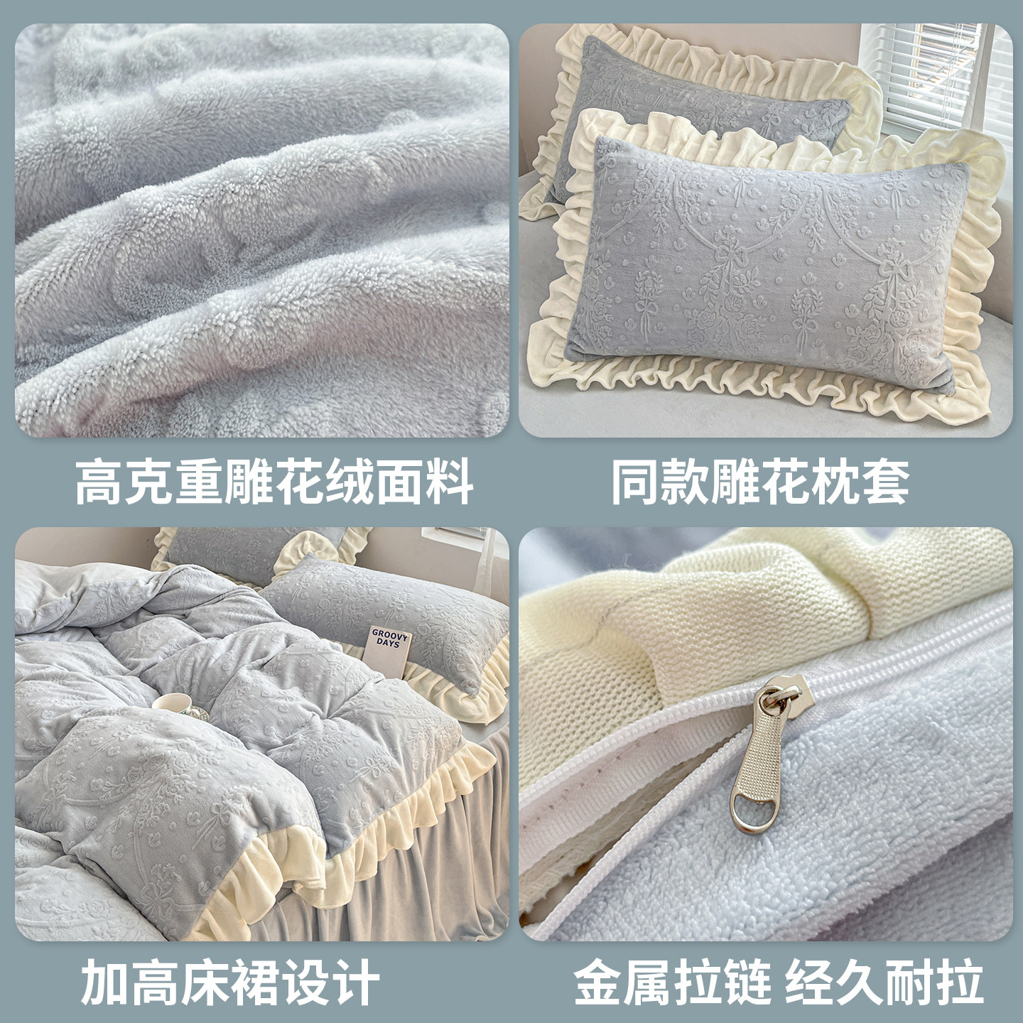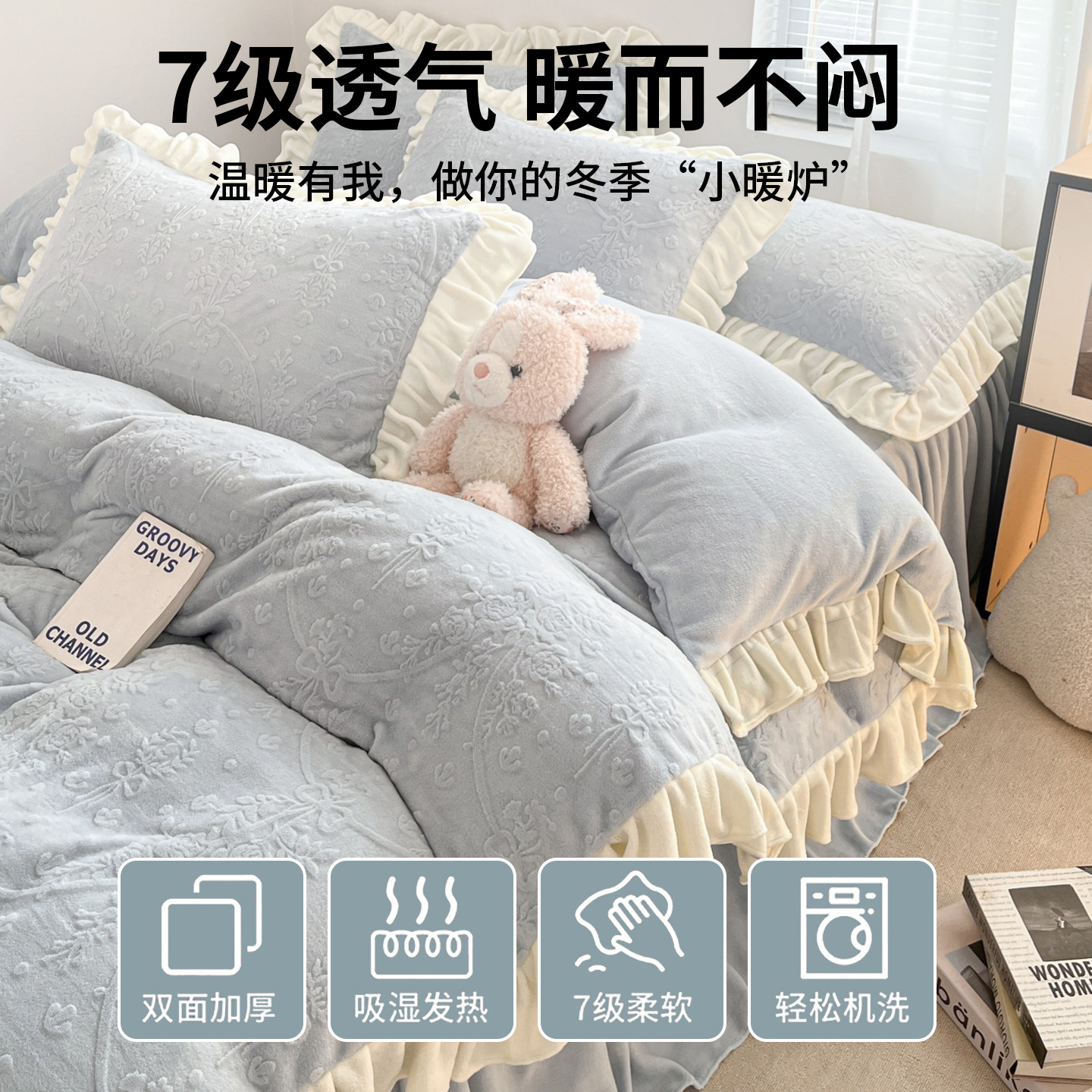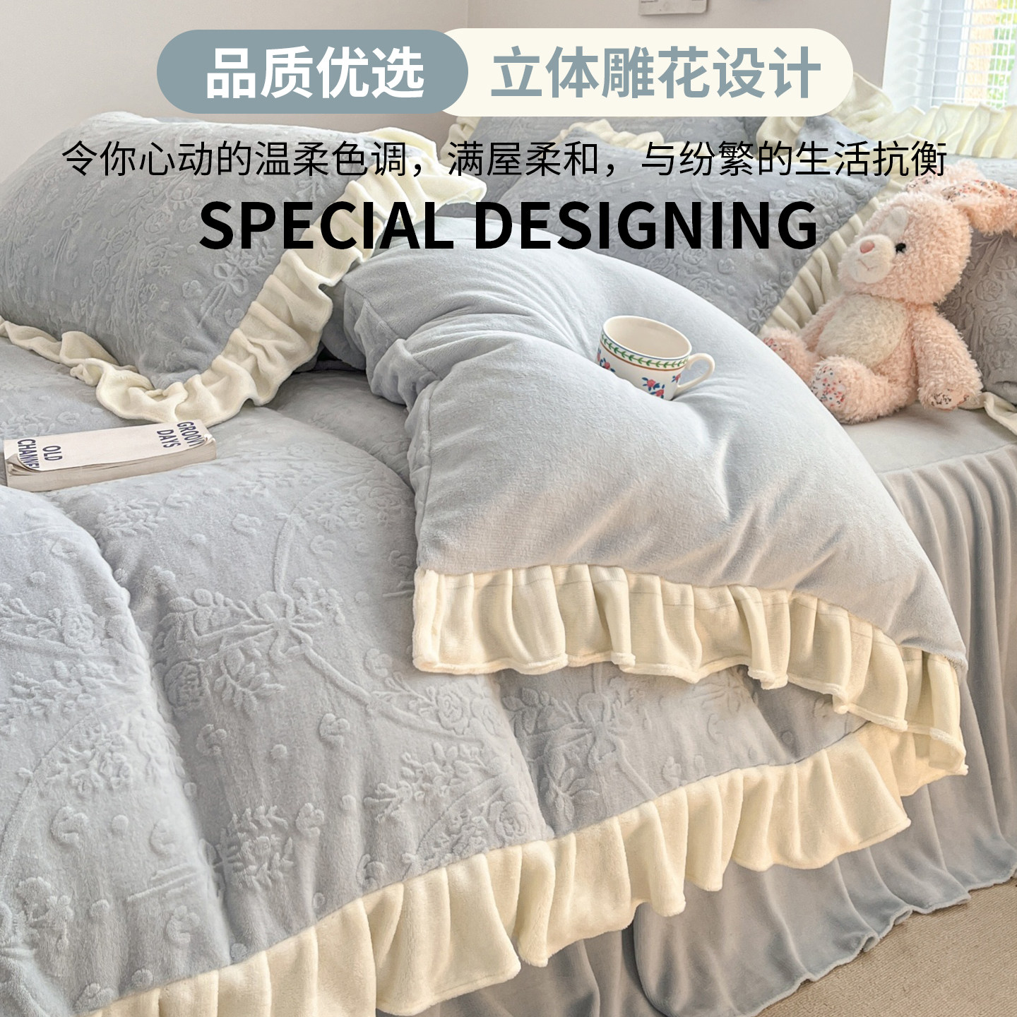 秋冬季公主风花边床上牛奶绒四件套床品双面绒被套加绒珊瑚绒床单