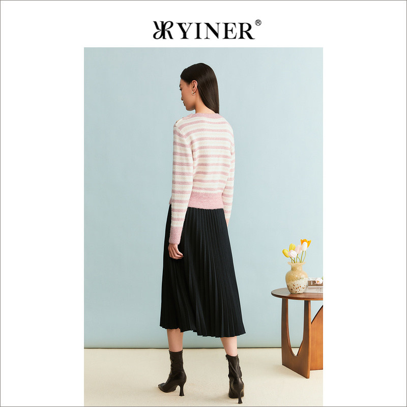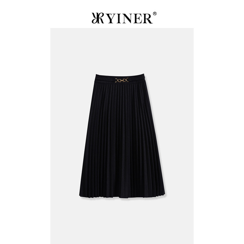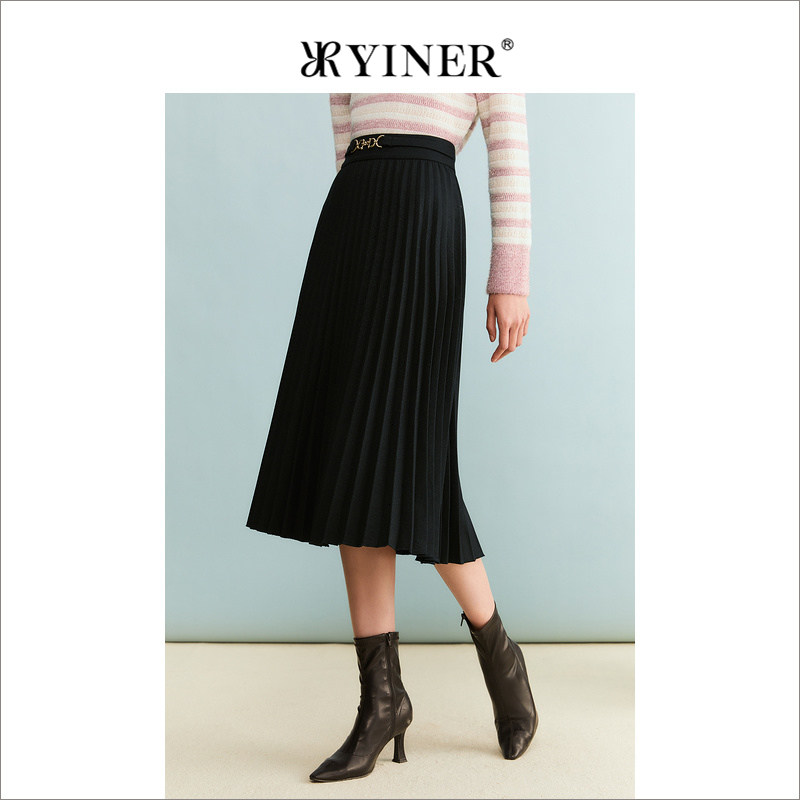 YINER音儿专选女装冬季质感压褶过膝小黑裙气质半身裙