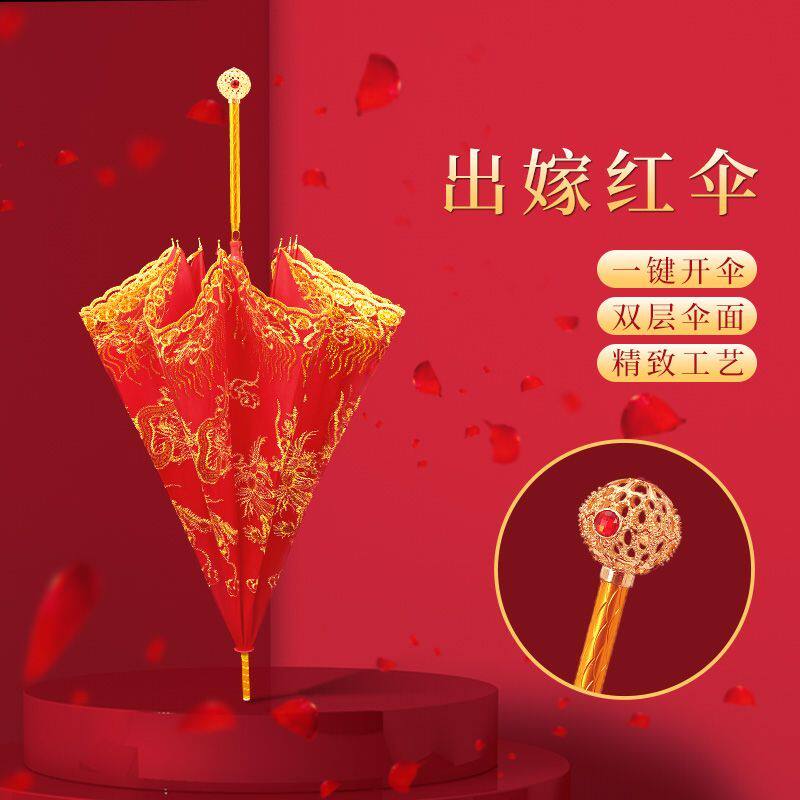 结婚红伞婚伞新娘出嫁伞红色婚庆用新款中式婚礼复古蕾丝长柄喜伞
