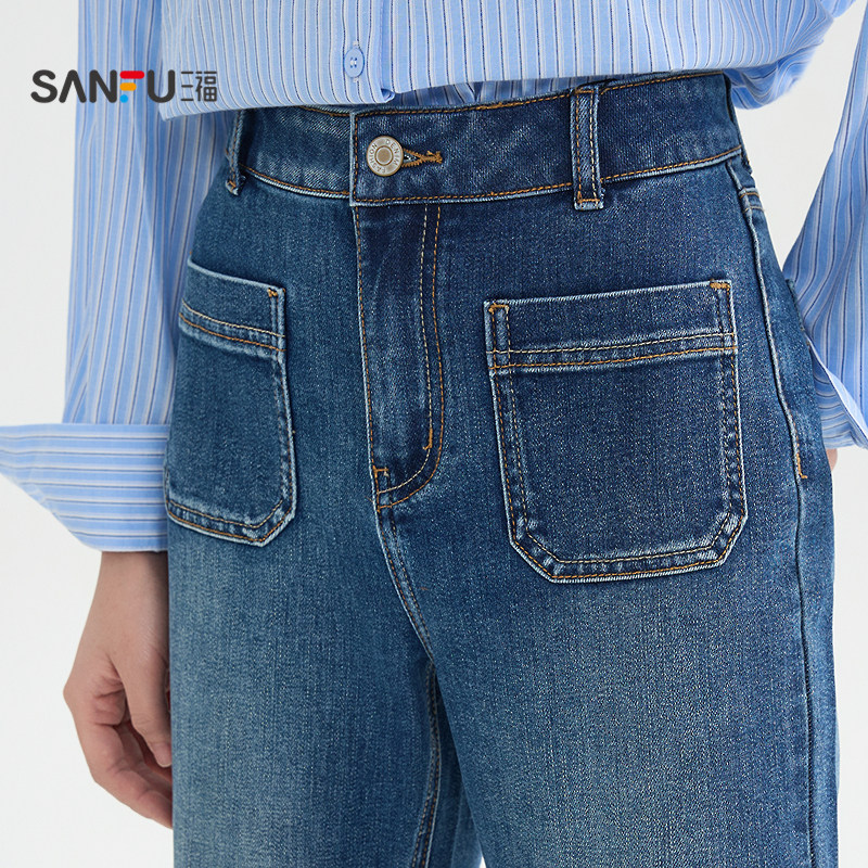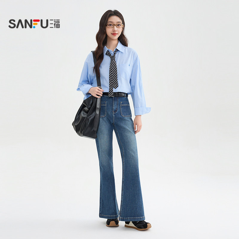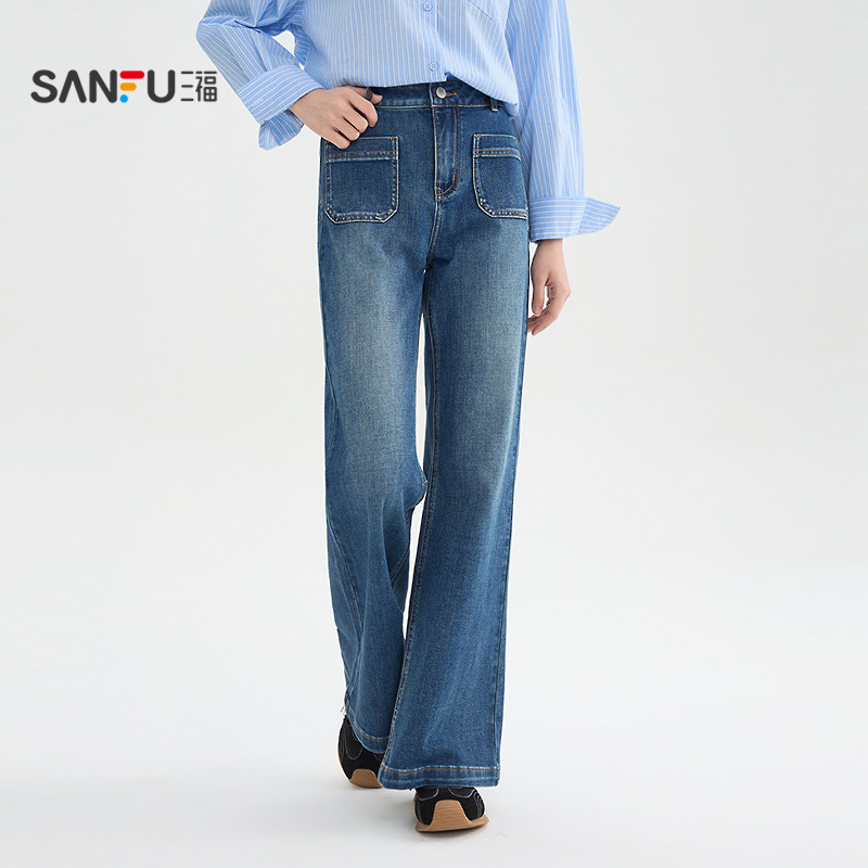 三福牛仔长裤女2026年春季时尚复古喇叭裤显瘦蓝色裤子女装514402