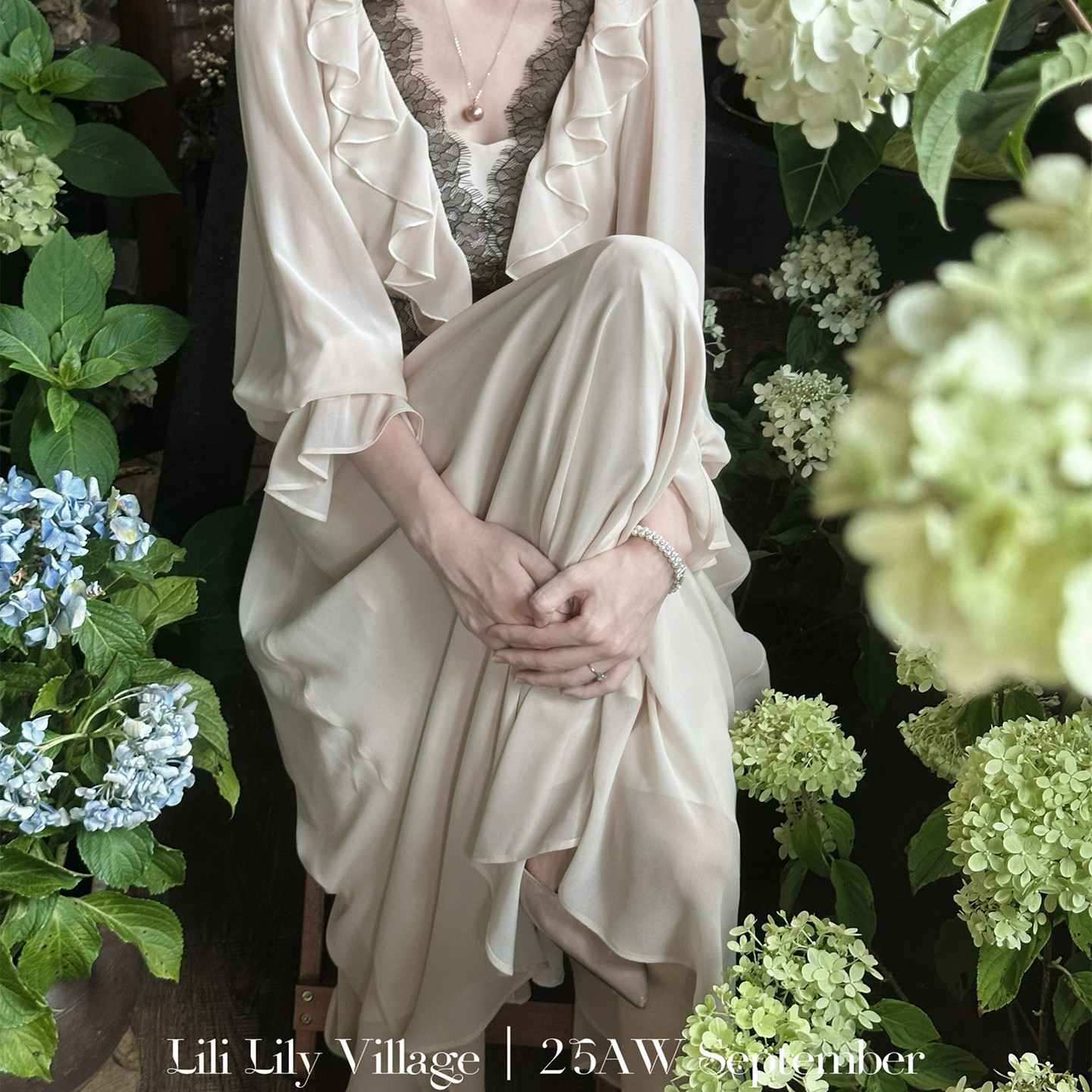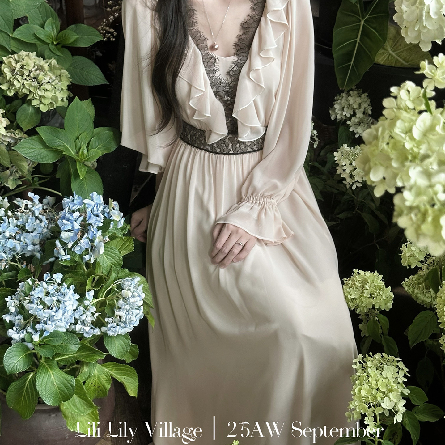 【秋雾】LIli百合乡原创撞色蕾丝优雅荷叶边灯笼袖仙气大摆连衣裙