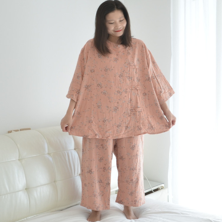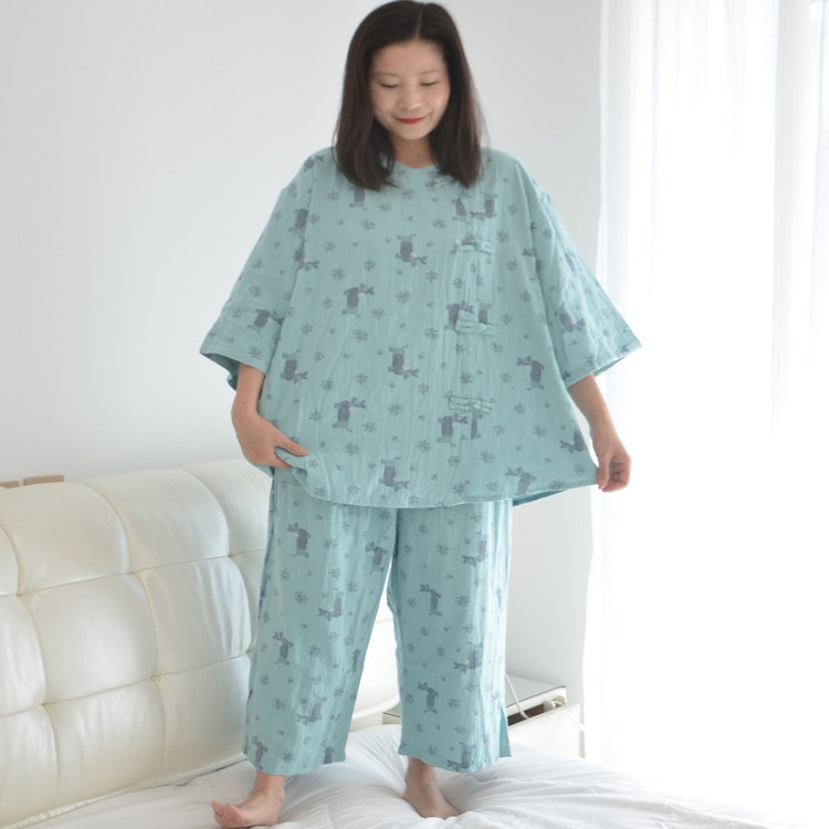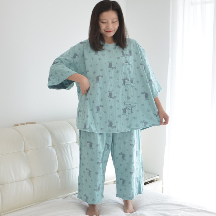 200斤加肥加大码纯棉纱布睡衣女胖MM春秋夏季中袖七分裤家居睡衣