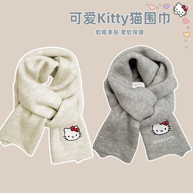HelloKitty凯蒂猫针织刺绣围巾女秋冬季保暖围脖学生灰色黑色粉色