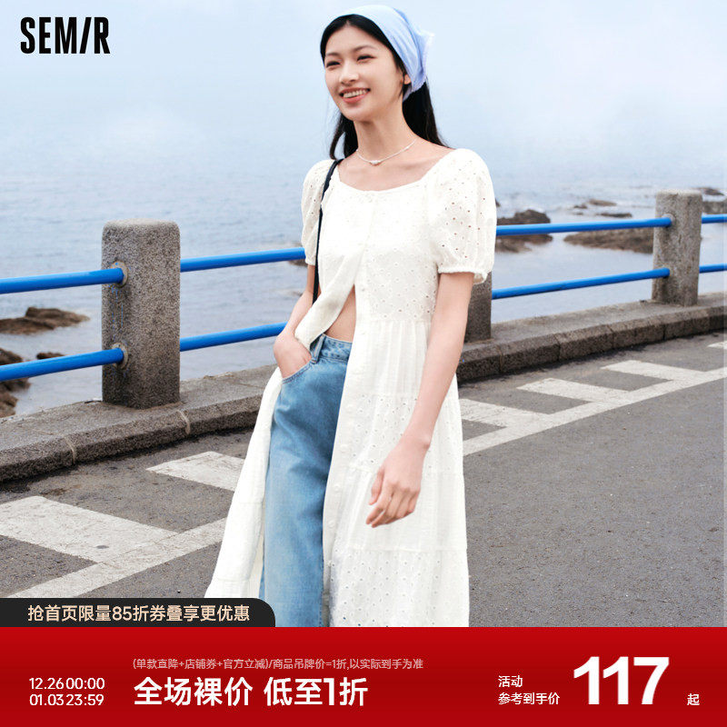 森马连衣裙女方领拼接中长裙度假风2024夏新款镂空肌理小白裙法式