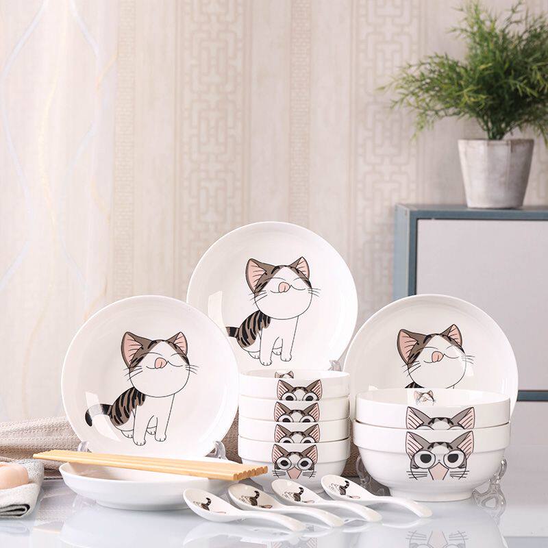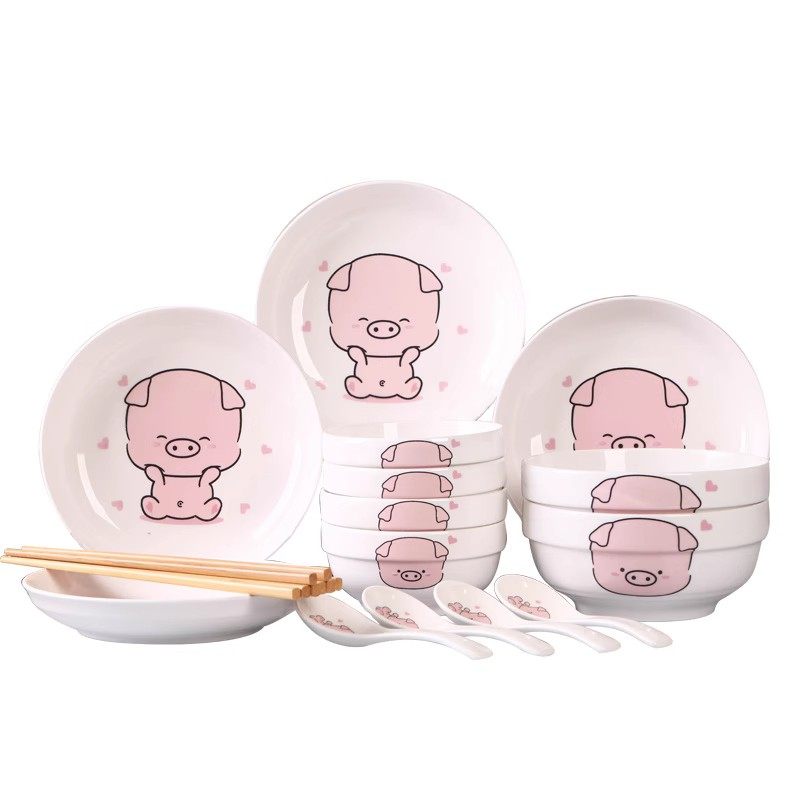 奶油风陶瓷碗家用卡通菜盘子可爱米饭碗汤碗釉下彩儿童餐具耐高温
