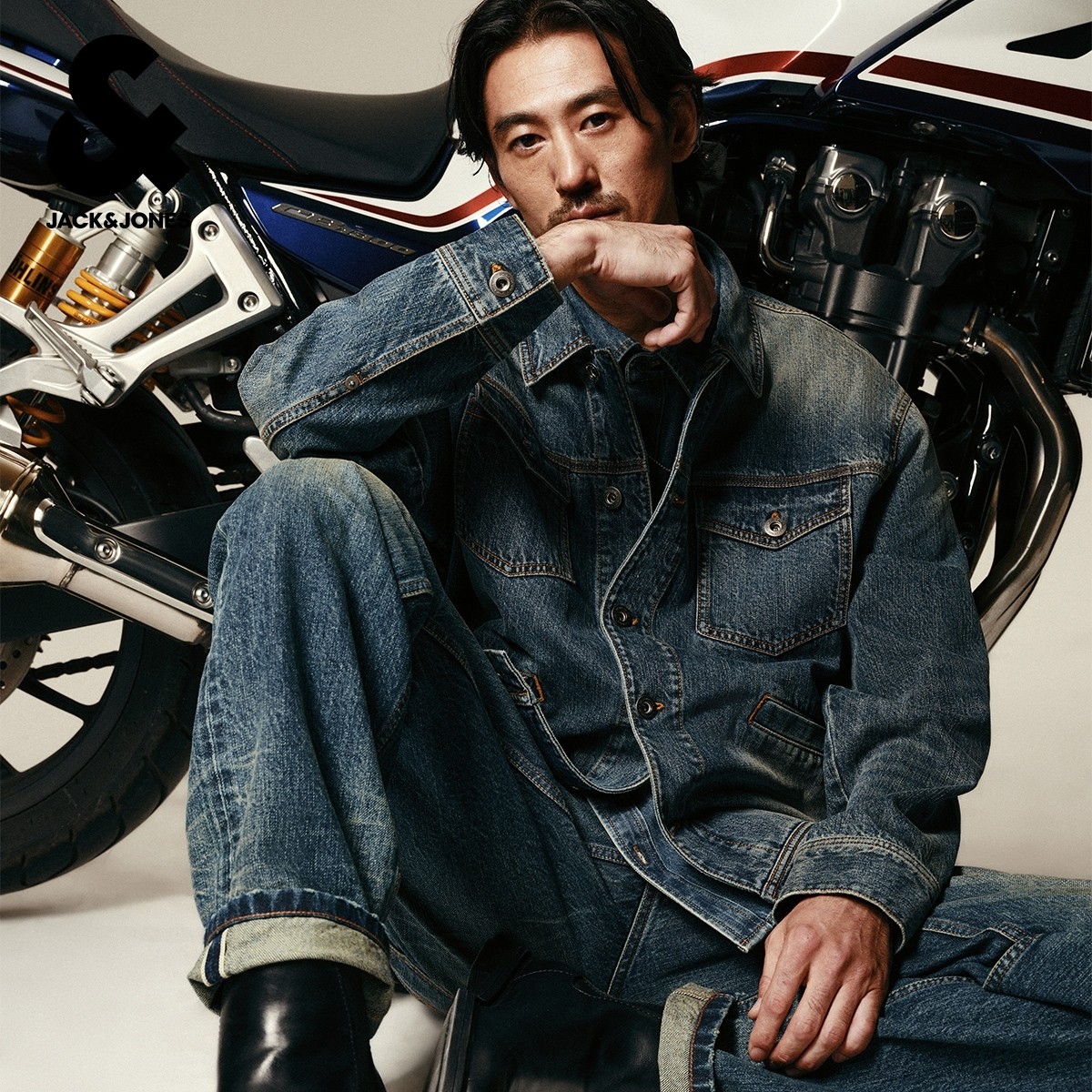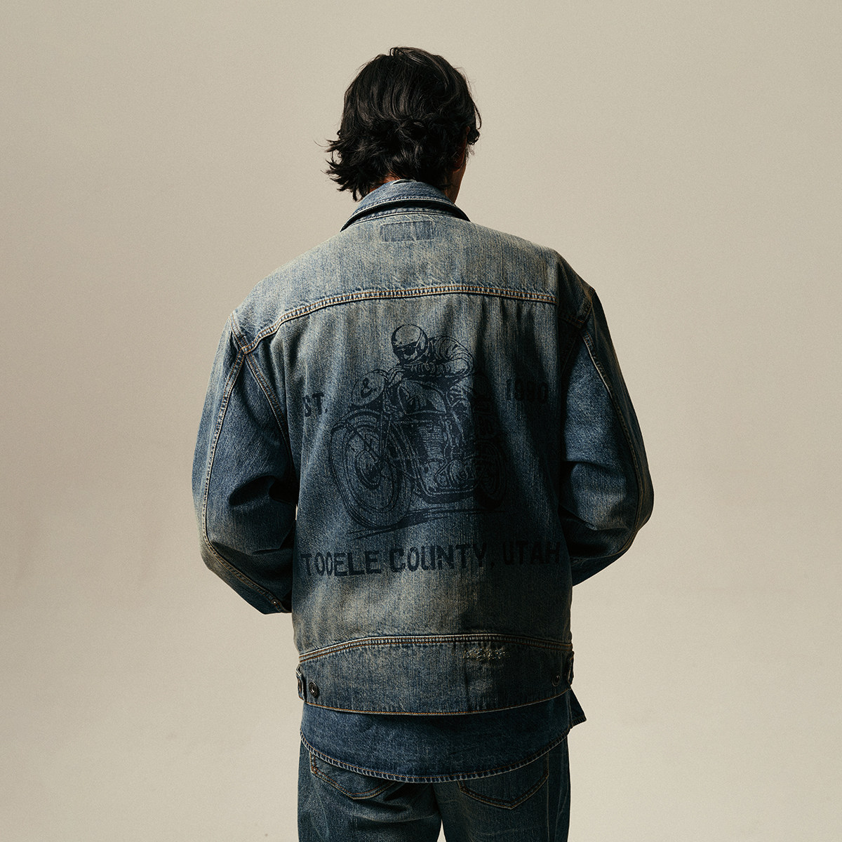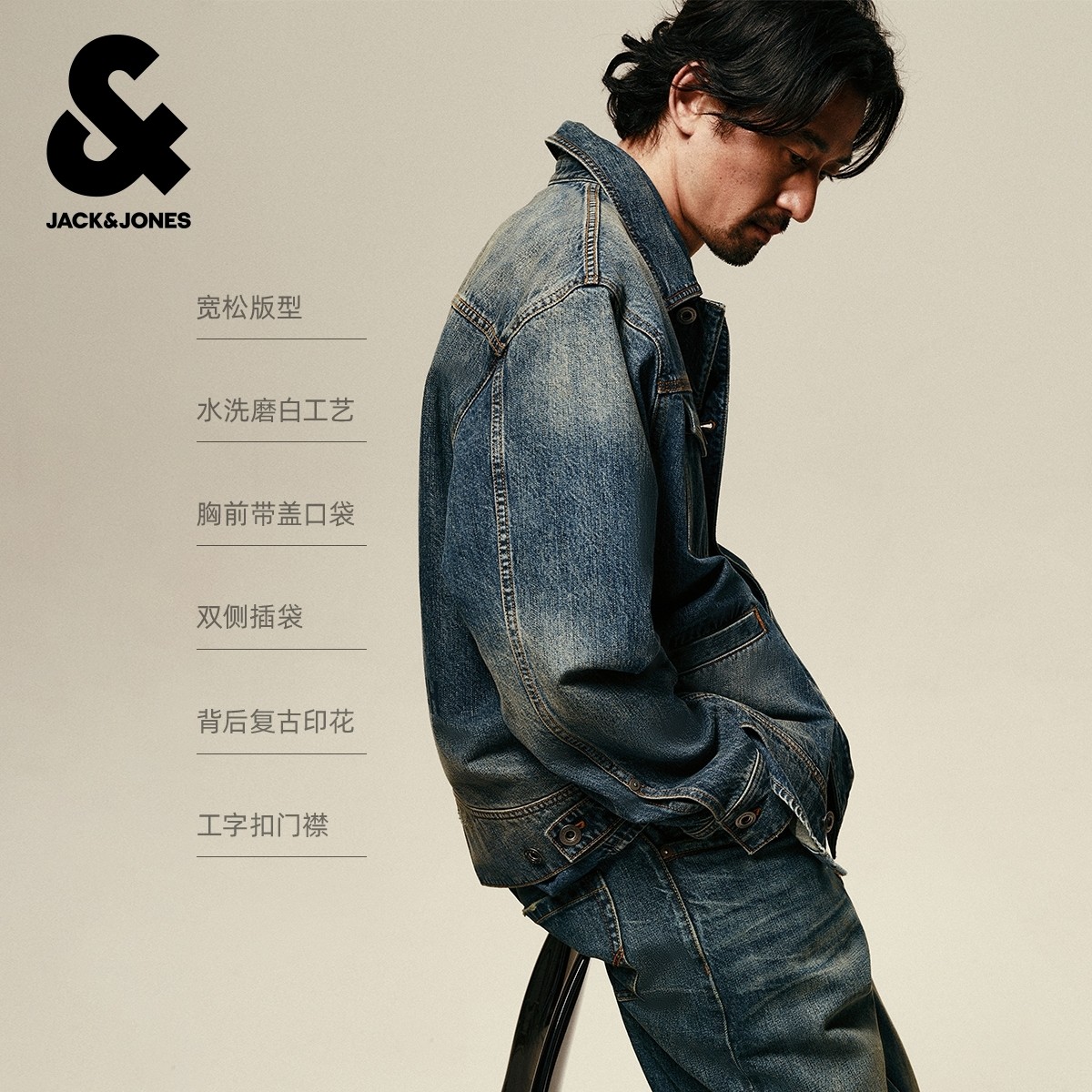 杰克琼斯男装秋冬季牛仔外套夹克翻领水洗磨白背后复古印花图案潮